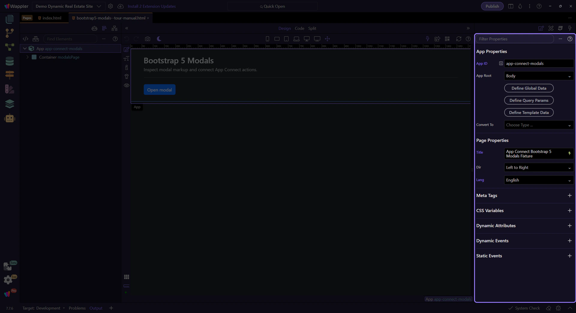 Section titled “Tour goals”By the end of this tour, you should be able to explain the full modal control loop in Wappler: what opens the modal, what closes it, which state or event drives that change, and where you inspect those bindings and actions in the UI.