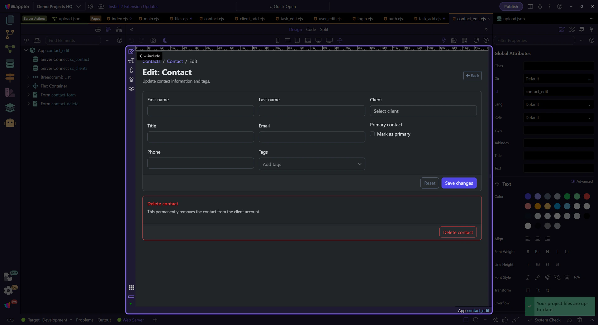 Section titled “The delete action is its own Server Connect form”#contact_delete has its own action, hidden id input, success state, and error state. That separation matters because destructive work should not disappear inside the richer update form contract.