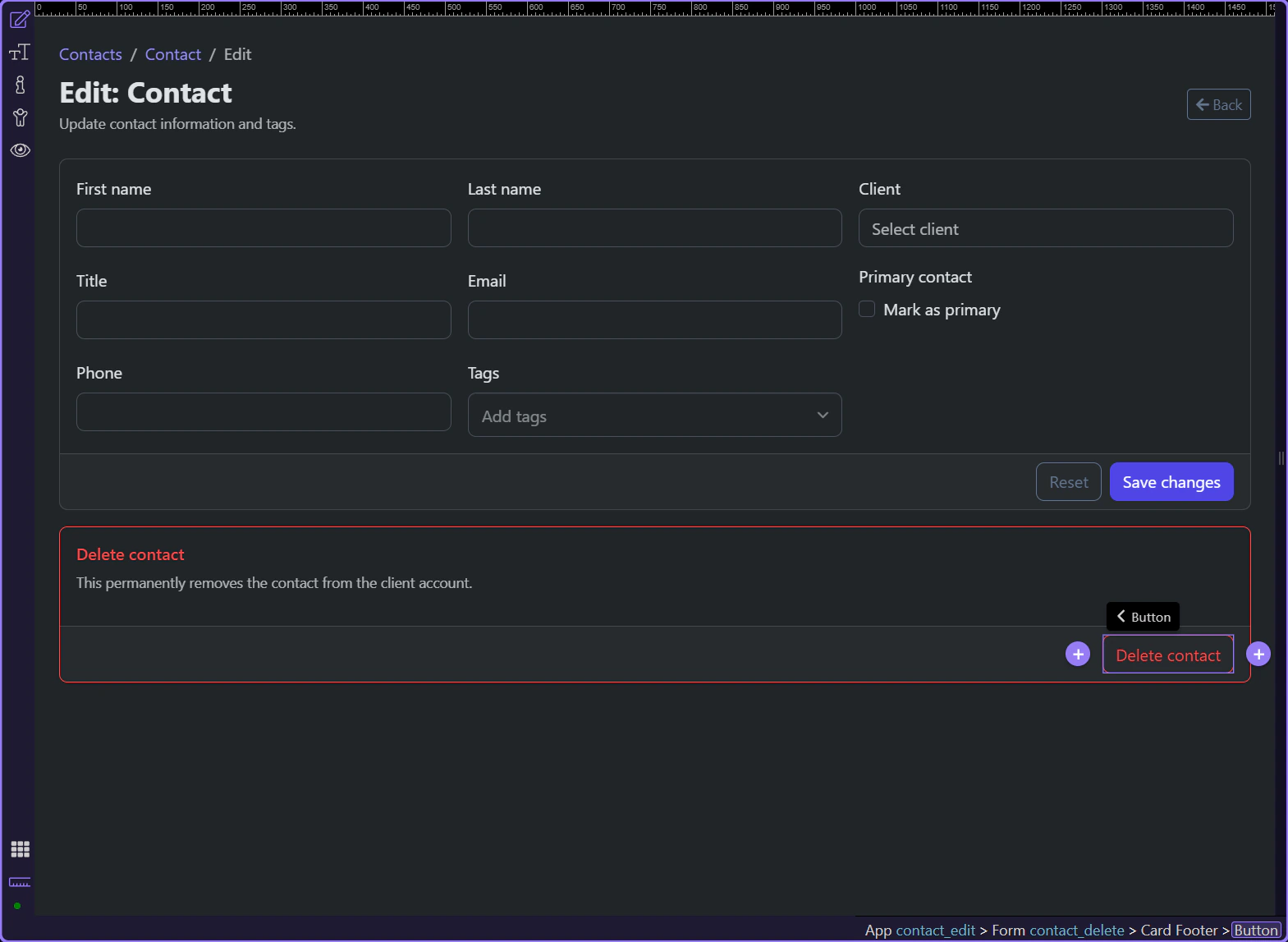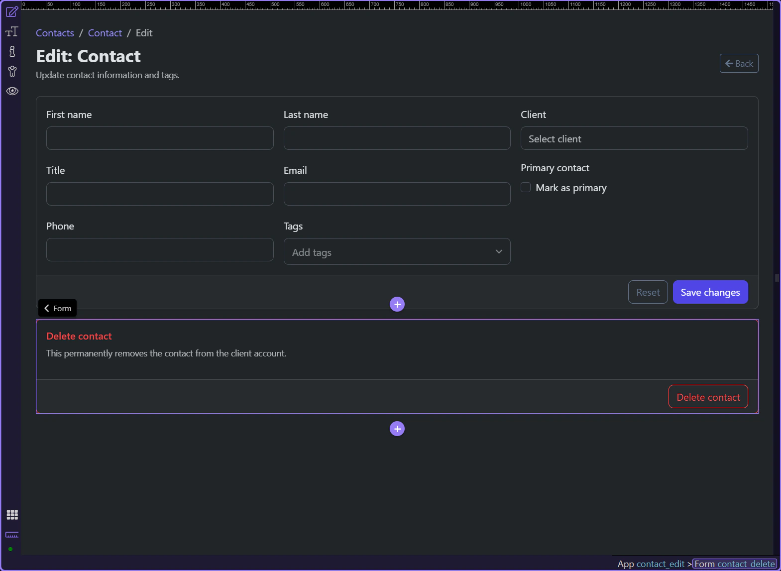 Section titled “Introduction”The contact edit page does something important with destructive actions: it keeps delete separate from normal editing. App Connect makes the delete path legible by giving it its own form, confirmation moment, request state, and a clear route back to the contacts list after success.