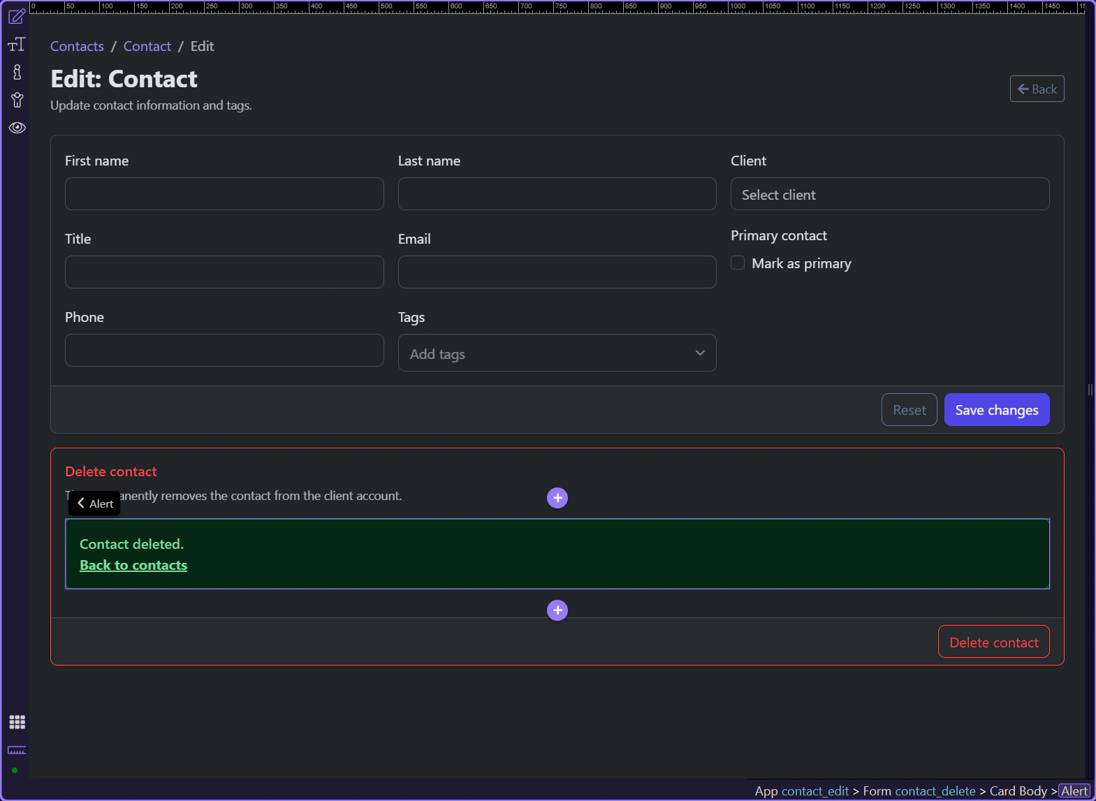 Section titled “The success state ends with a route back to the contacts list”After a successful delete, the page does not leave the user stranded on a now-invalid record. The success alert exposes a direct return link to /contacts, so the destructive flow ends in a safe list view instead of a broken detail context.