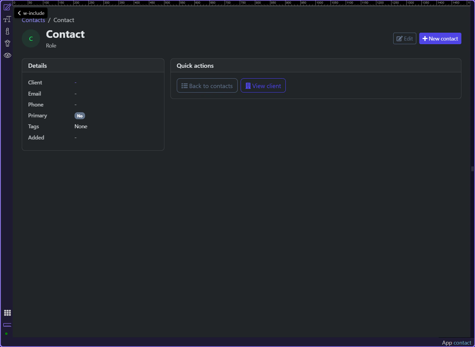 Section titled “The page binds one contact object into details, badges, and links”The detail page stays readable because the cards, badges, and action links all bind back to sc_contact.data.contact. Client name, primary badge, tags, and edit navigation all come from the same loaded record object.