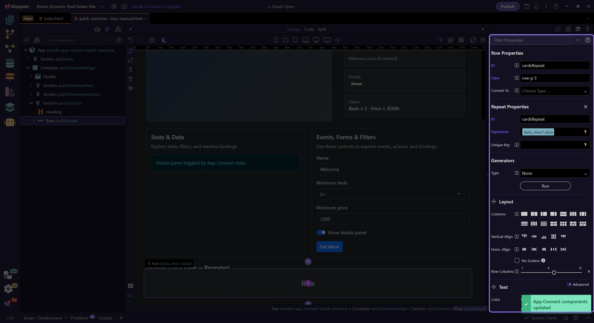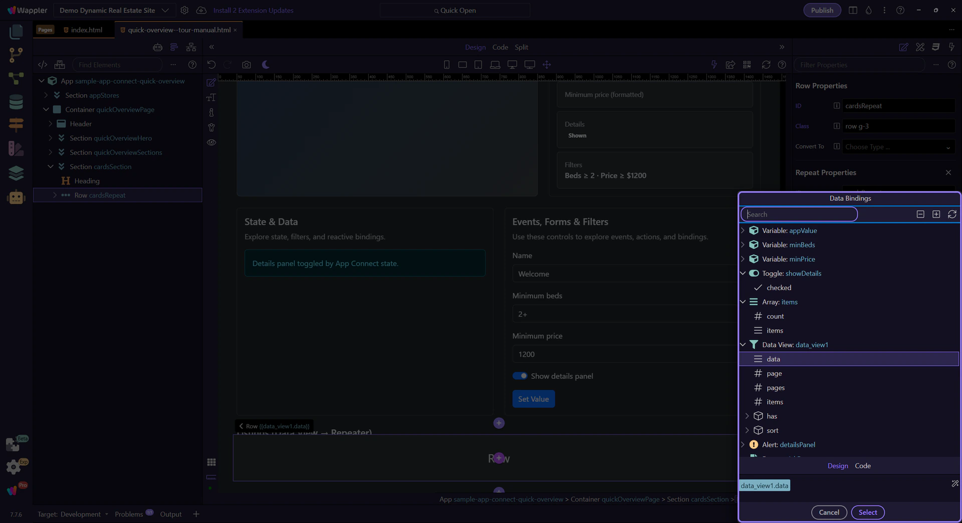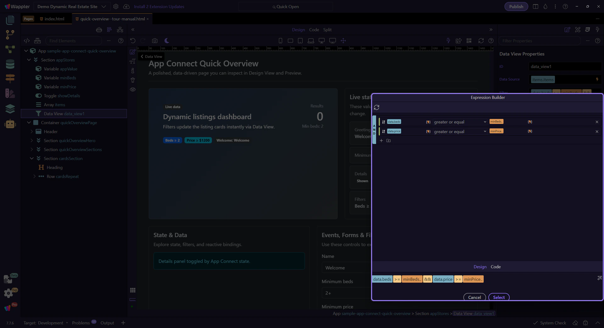 Section titled “Introduction”This tour uses a dedicated App Connect tour page so you can explore bindings and pickers safely. You’ll learn how Wappler builds expressions visually, how scope affects what you can pick, and how Design vs Code view affects how you edit bindings.