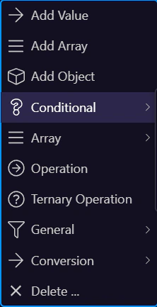 Section titled “Context menu (categories + actions)”This menu is built from formatter rules and is context-sensitive (selection + input type). Use it to add new formatters, transform types, and build longer chains quickly. Some entries are simple actions; others open submenus with more specific options.