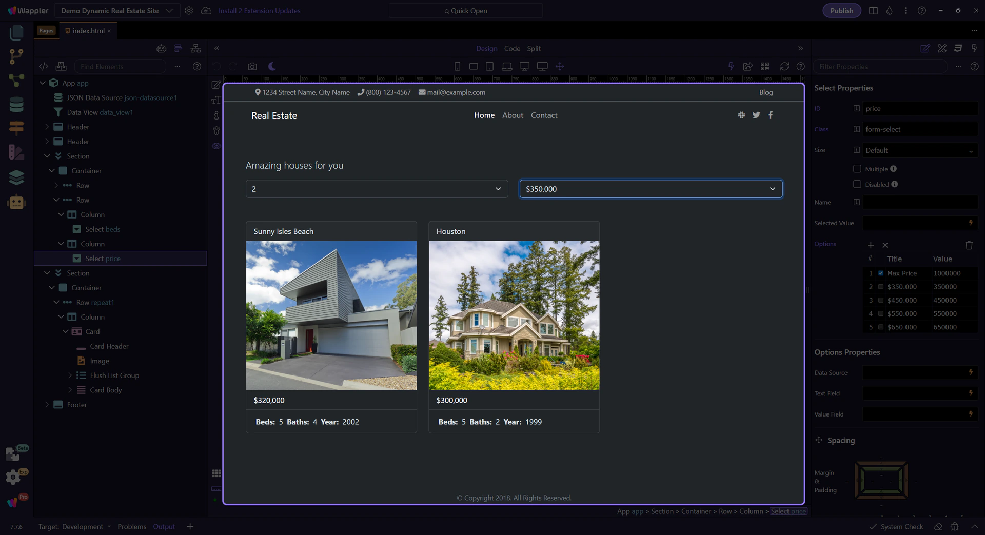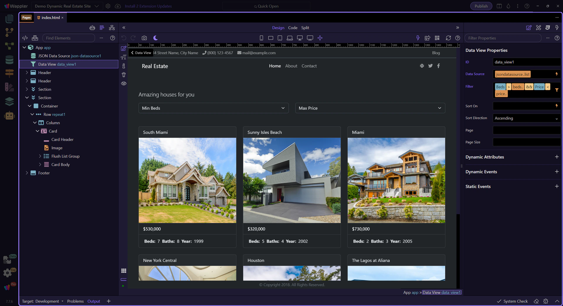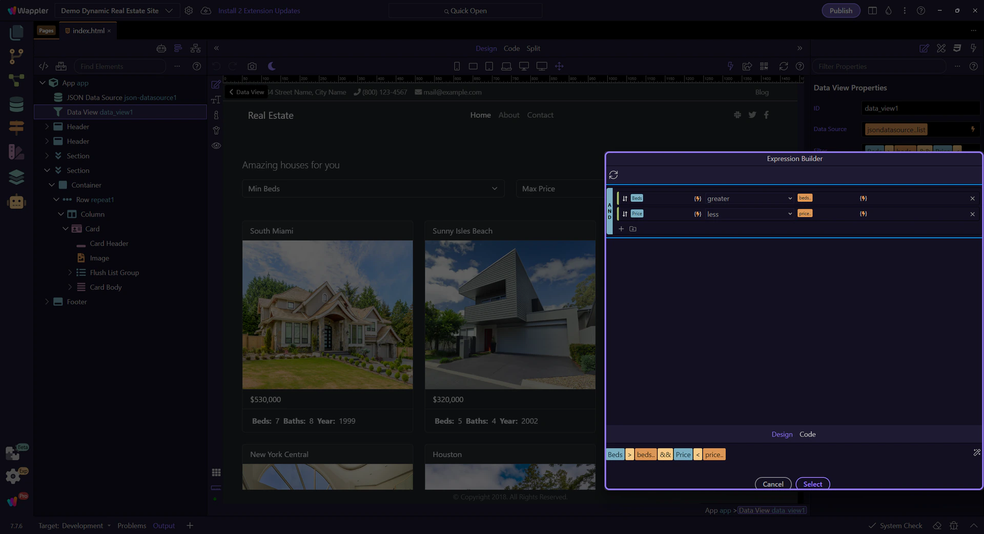 Guided walkthrough of the Demo Dynamic Real Estate Site, focusing on App Connect data loading, filtering, and UI bindings.