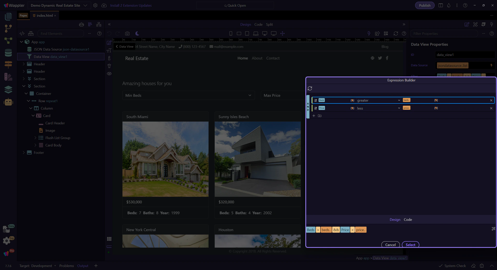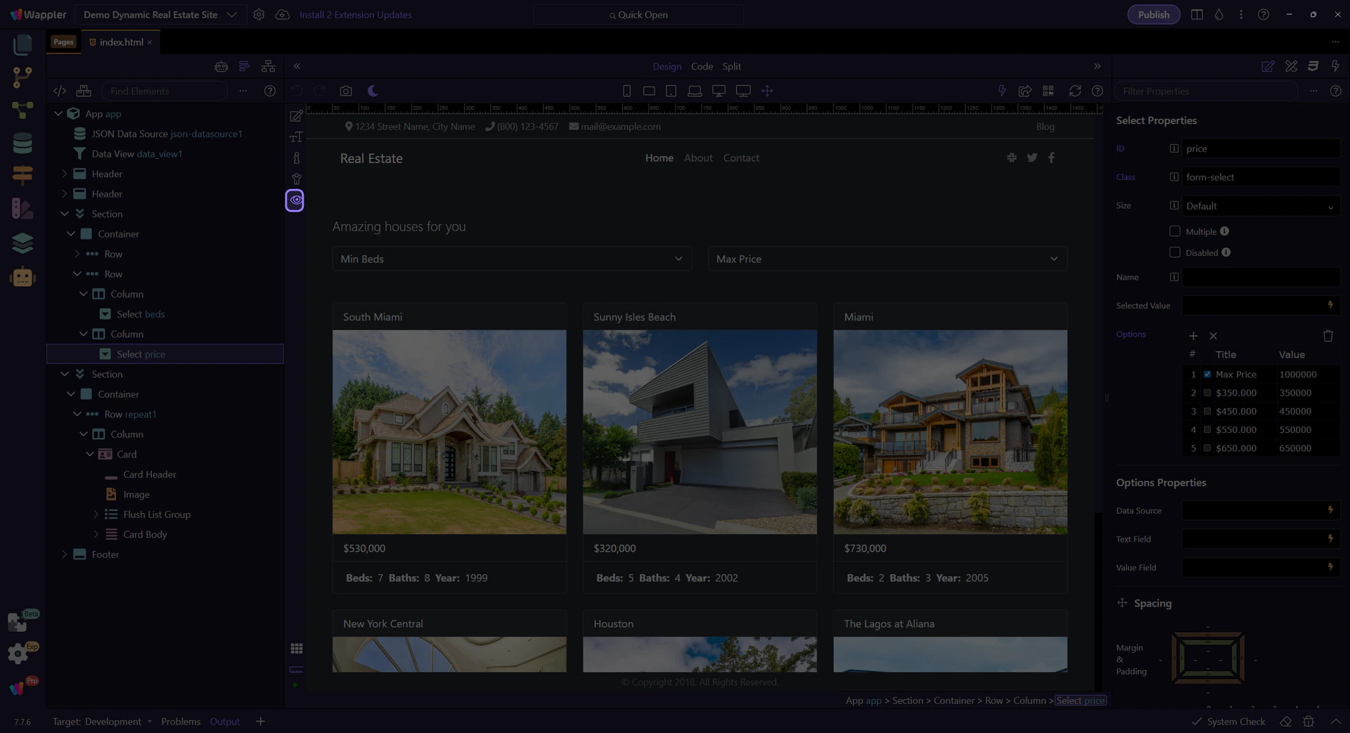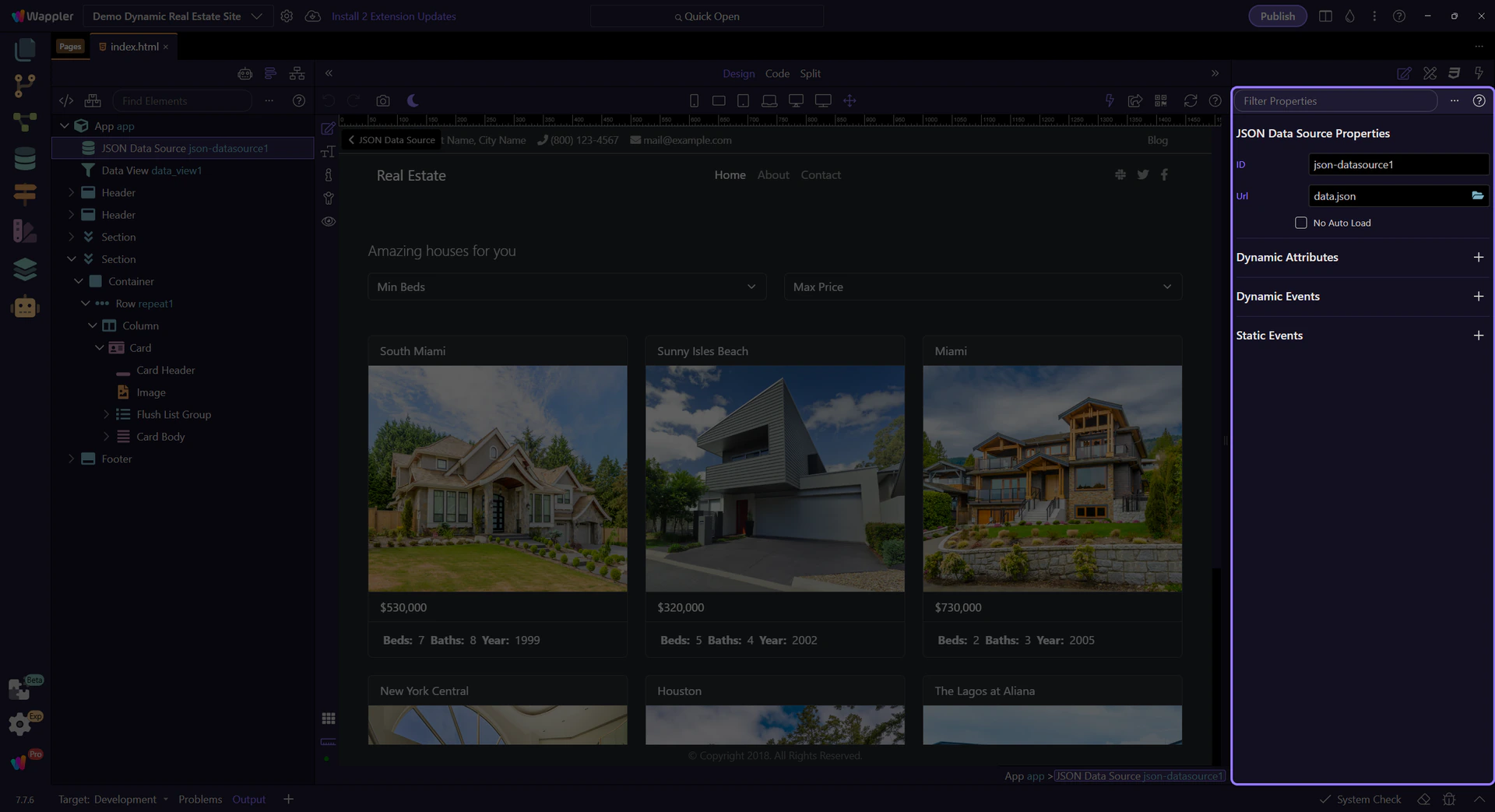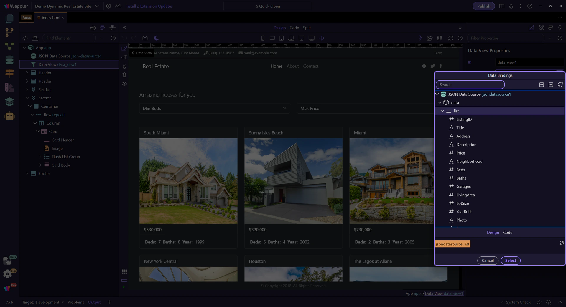 Section titled “Opening the home page”We open index.html in Design View. This page renders the listings and uses App Connect bindings to show data.