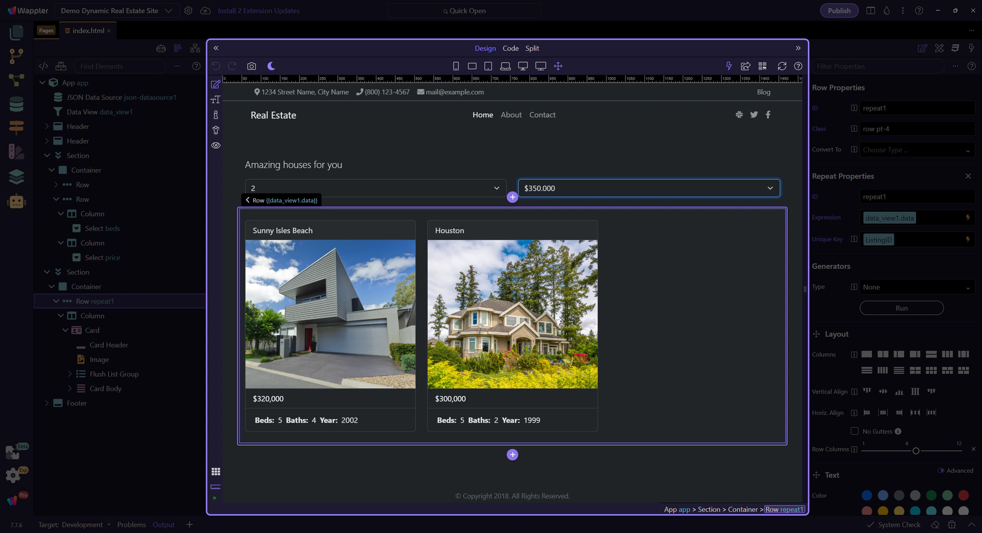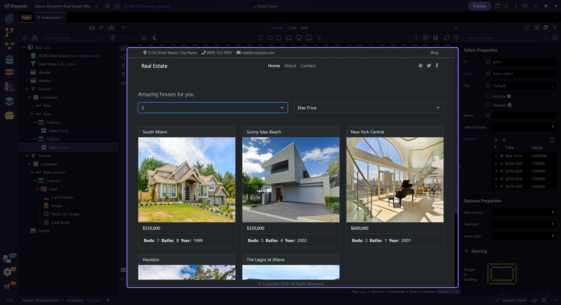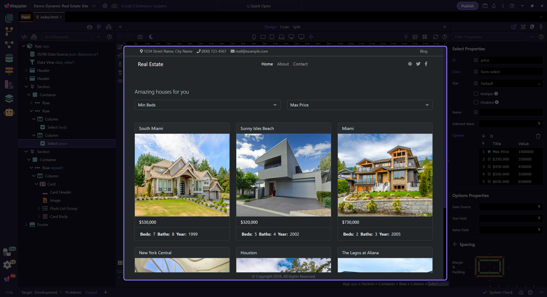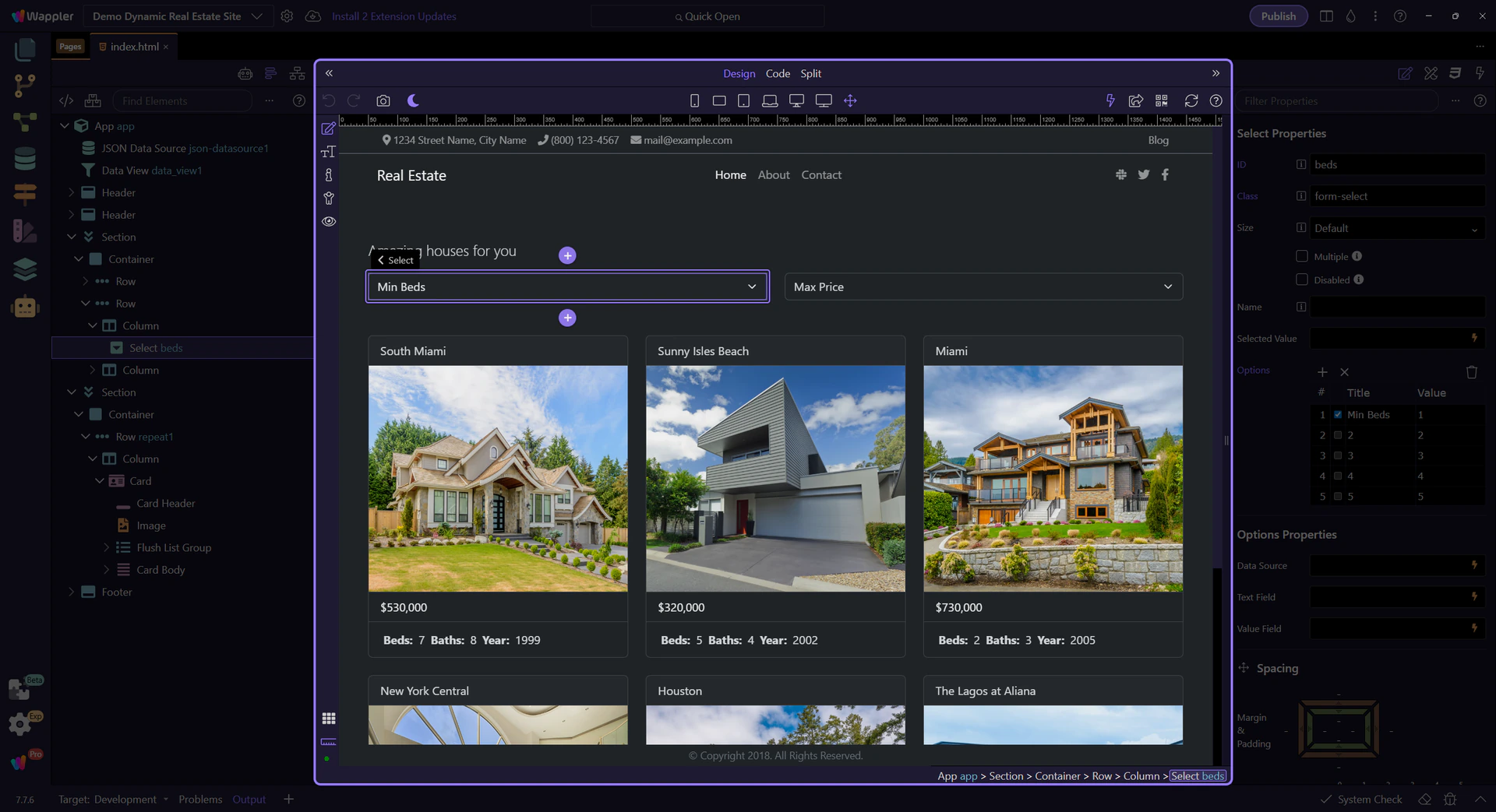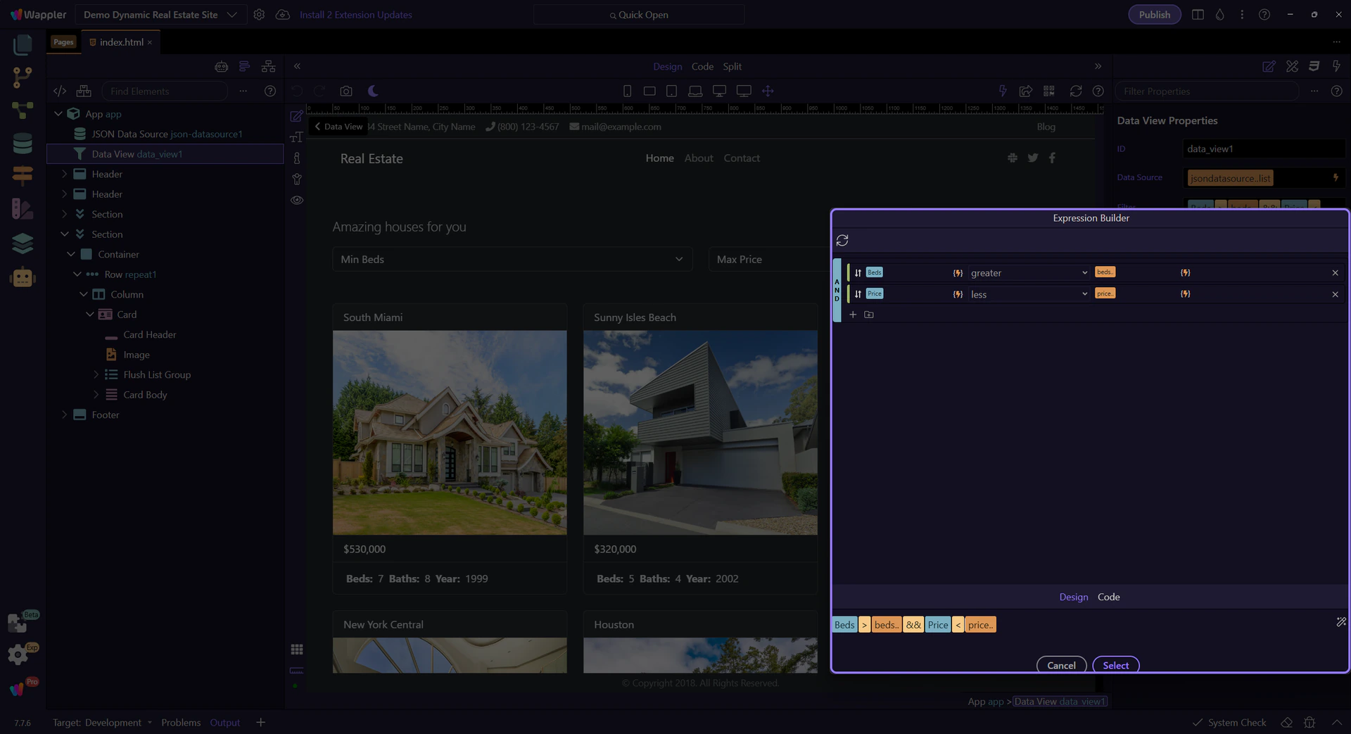 Section titled “Opening the home page”We open index.html in Design View. This page renders the listings and uses App Connect bindings to show data.