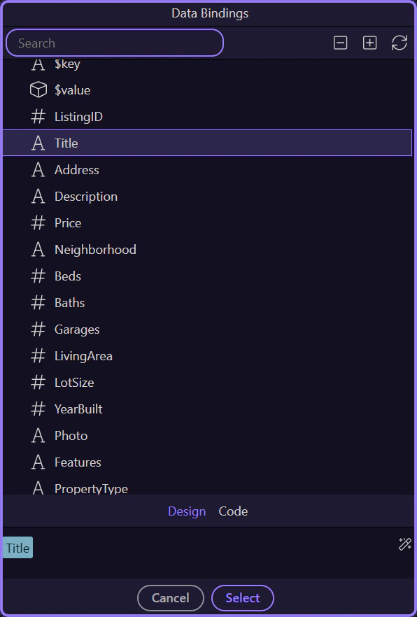 Section titled “Text binding element”This text element displays data from each item (like Title or Beds).