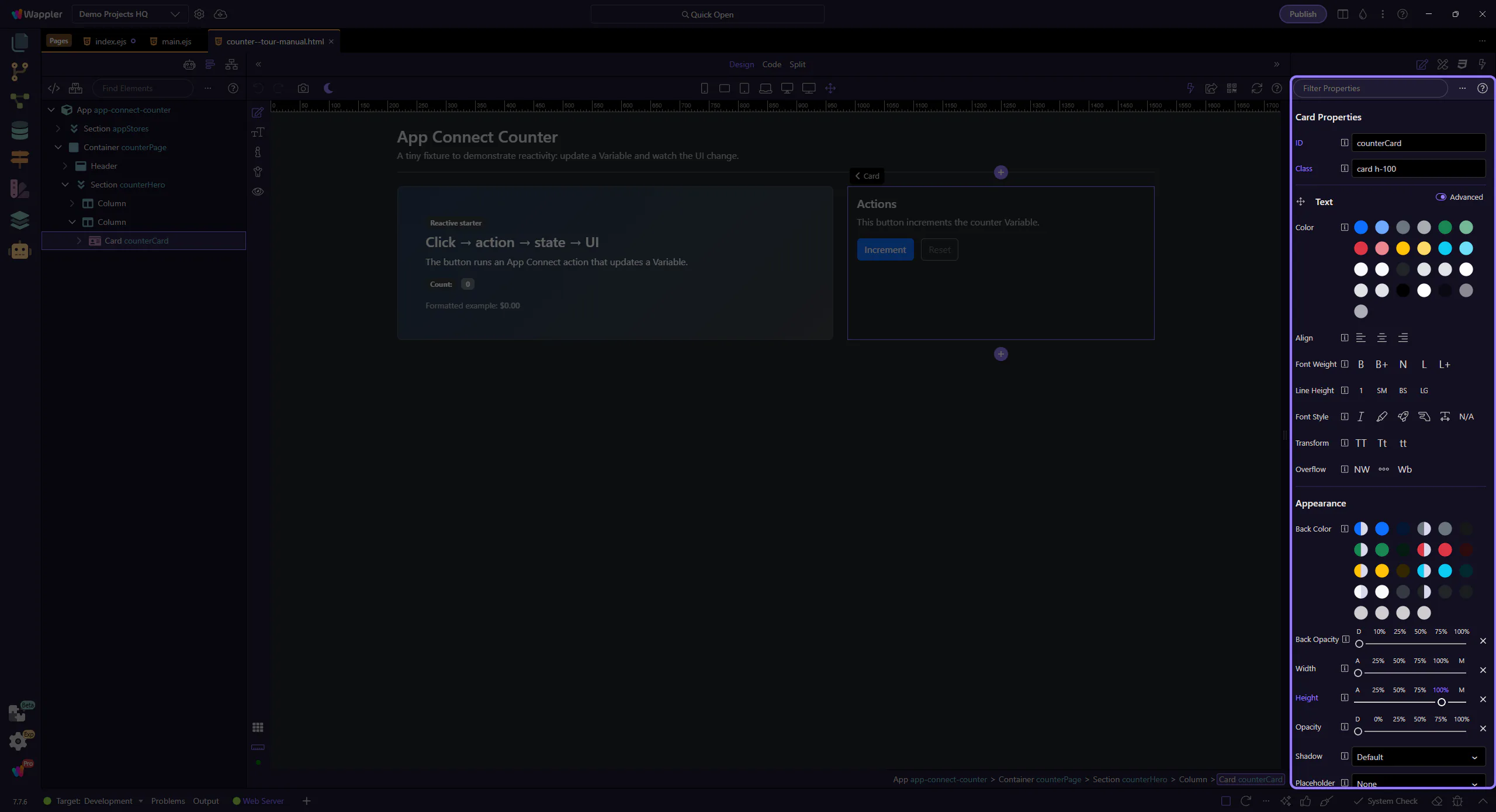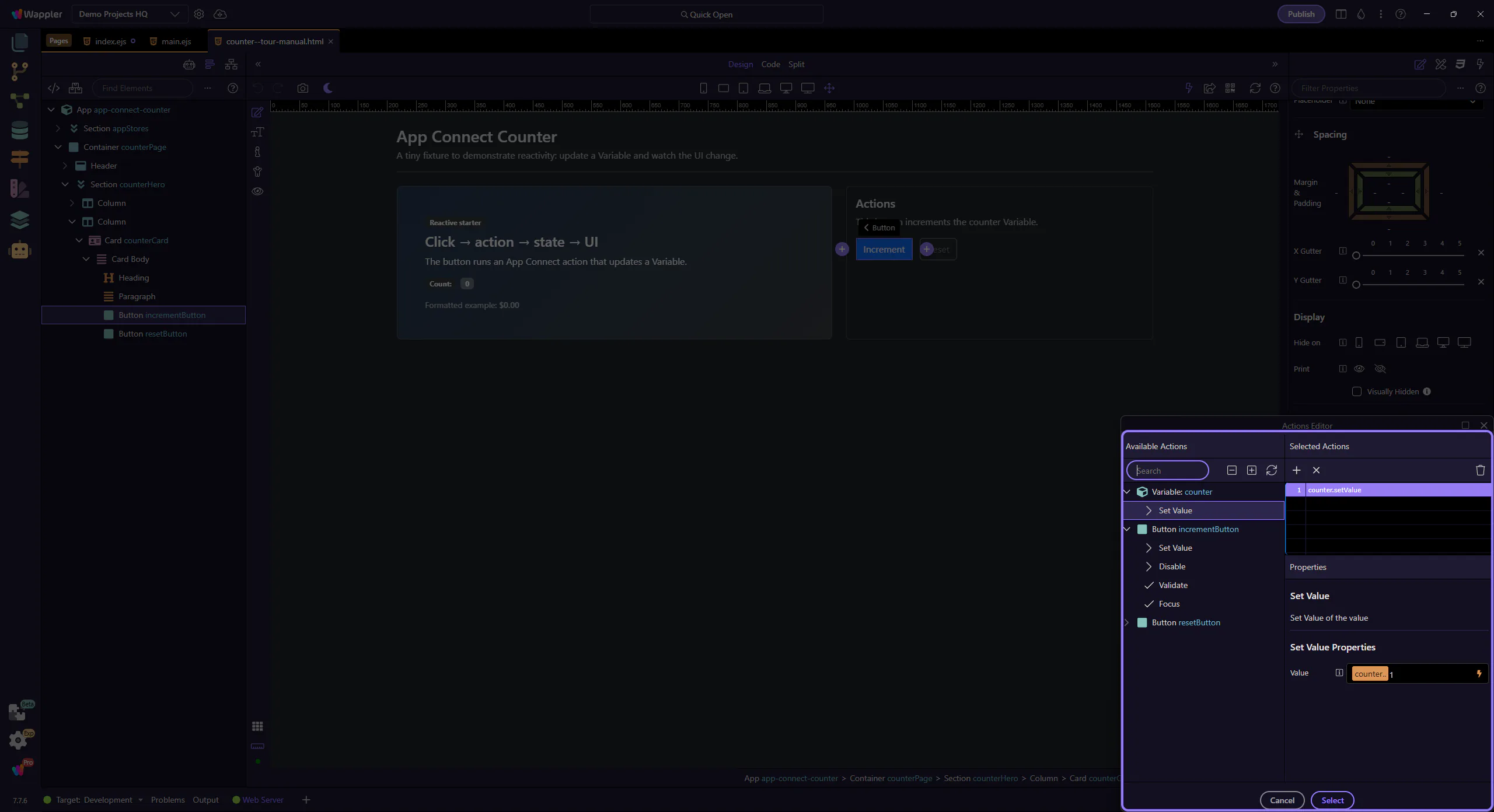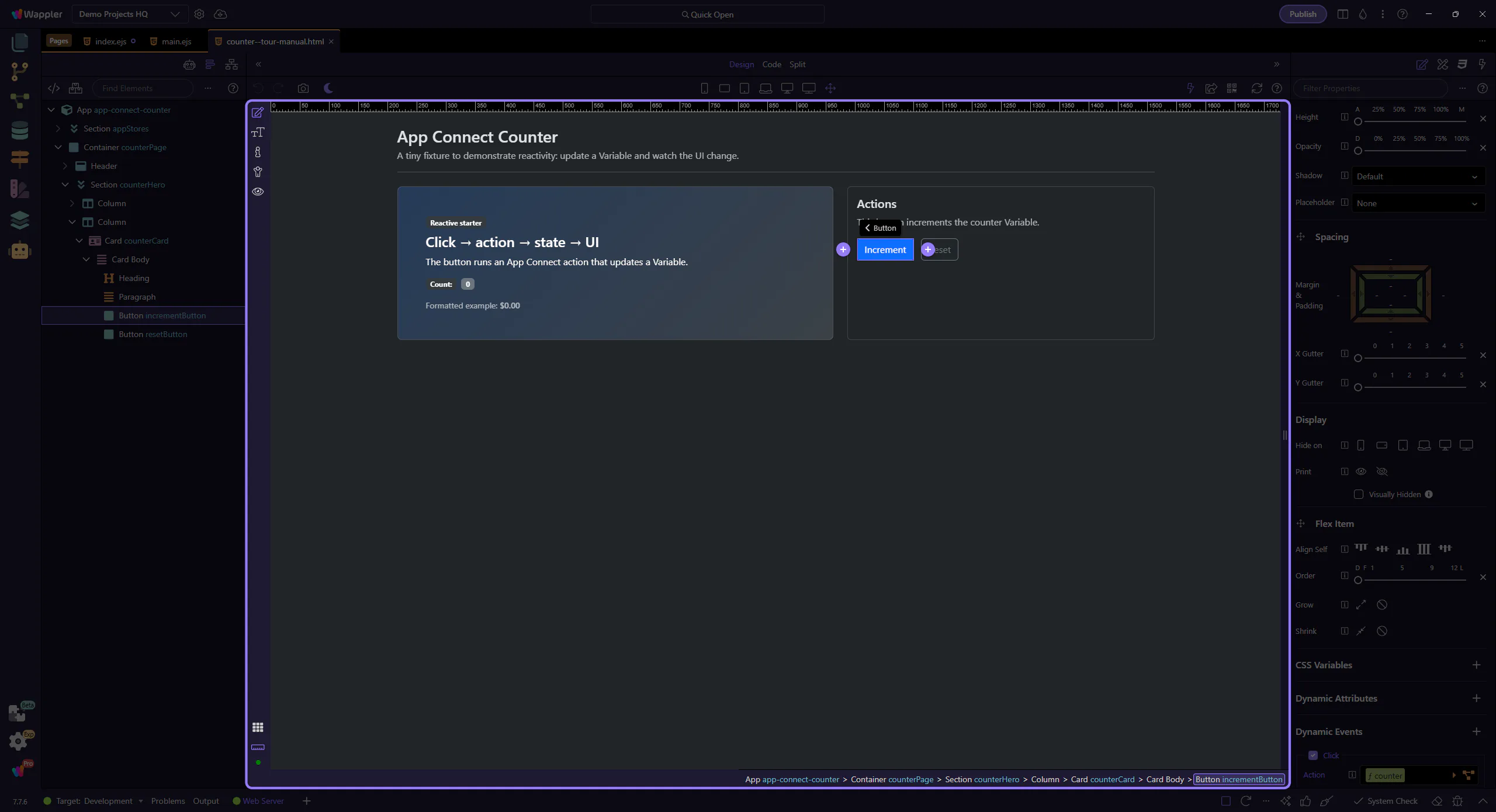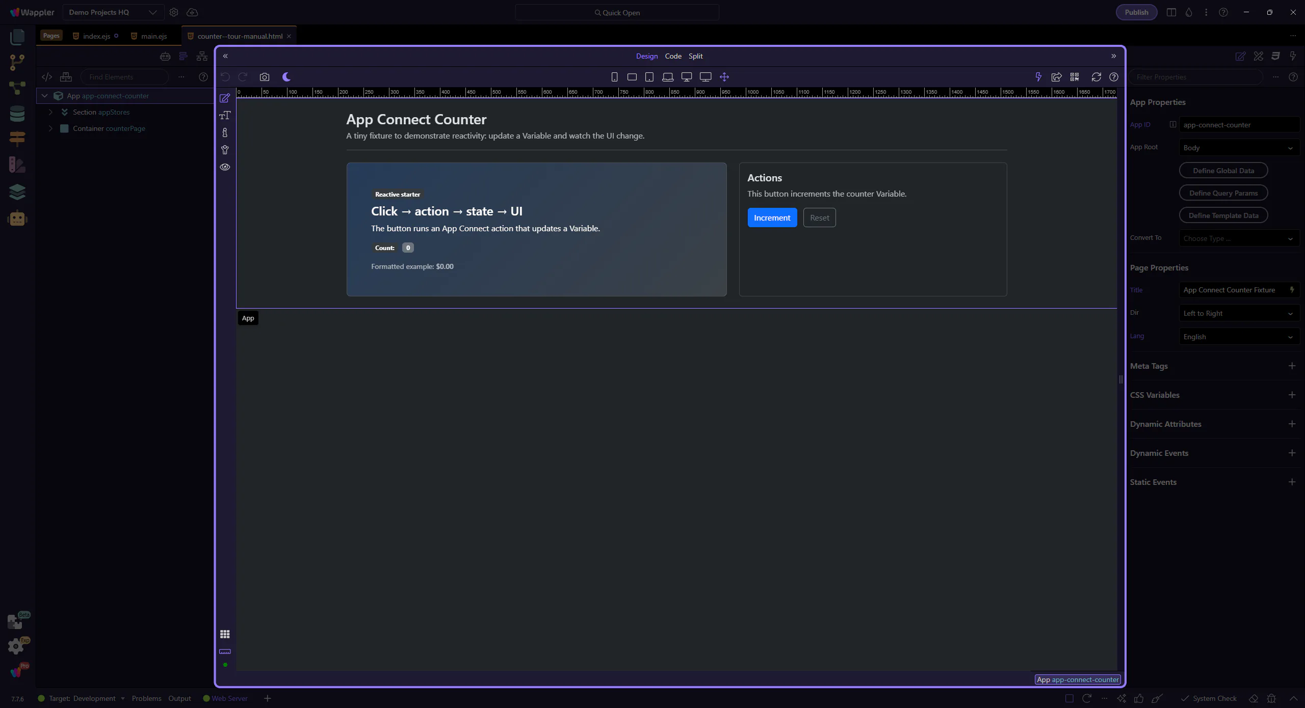 Section titled “Open the tour page”This tour opens a small counter page so you can inspect an event/action flow.