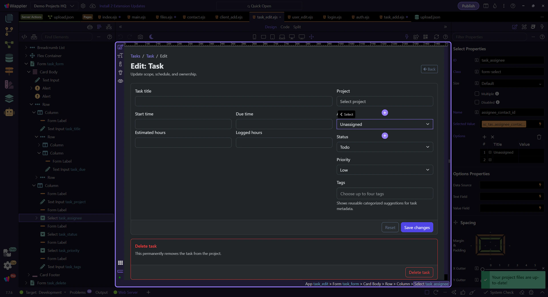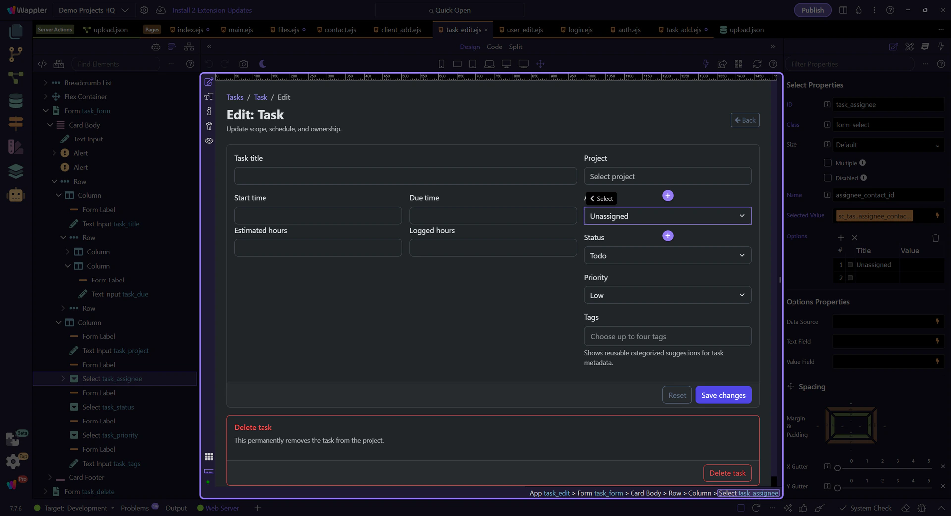 Section titled “Introduction”In Demo Projects HQ, the Assignee field on the task edit form is a real dynamic select menu. It is populated from the contacts dataset, keeps the current assignee selected when a task loads, and still offers a clean Unassigned fallback when no contact should be stored. This tour stays on that concrete field so you can connect the data source, the selected value, and the final form submission contract without falling back to a synthetic dropdown example.