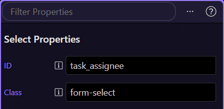 Section titled “Properties panel shows the full dropdown contract”With the Assignee field selected, the Properties panel becomes the best place to read the dynamic-select setup. Stay here as you review how Demo Projects HQ separates the generated options, the rebound selection, and the plain posted value that the update action expects.
