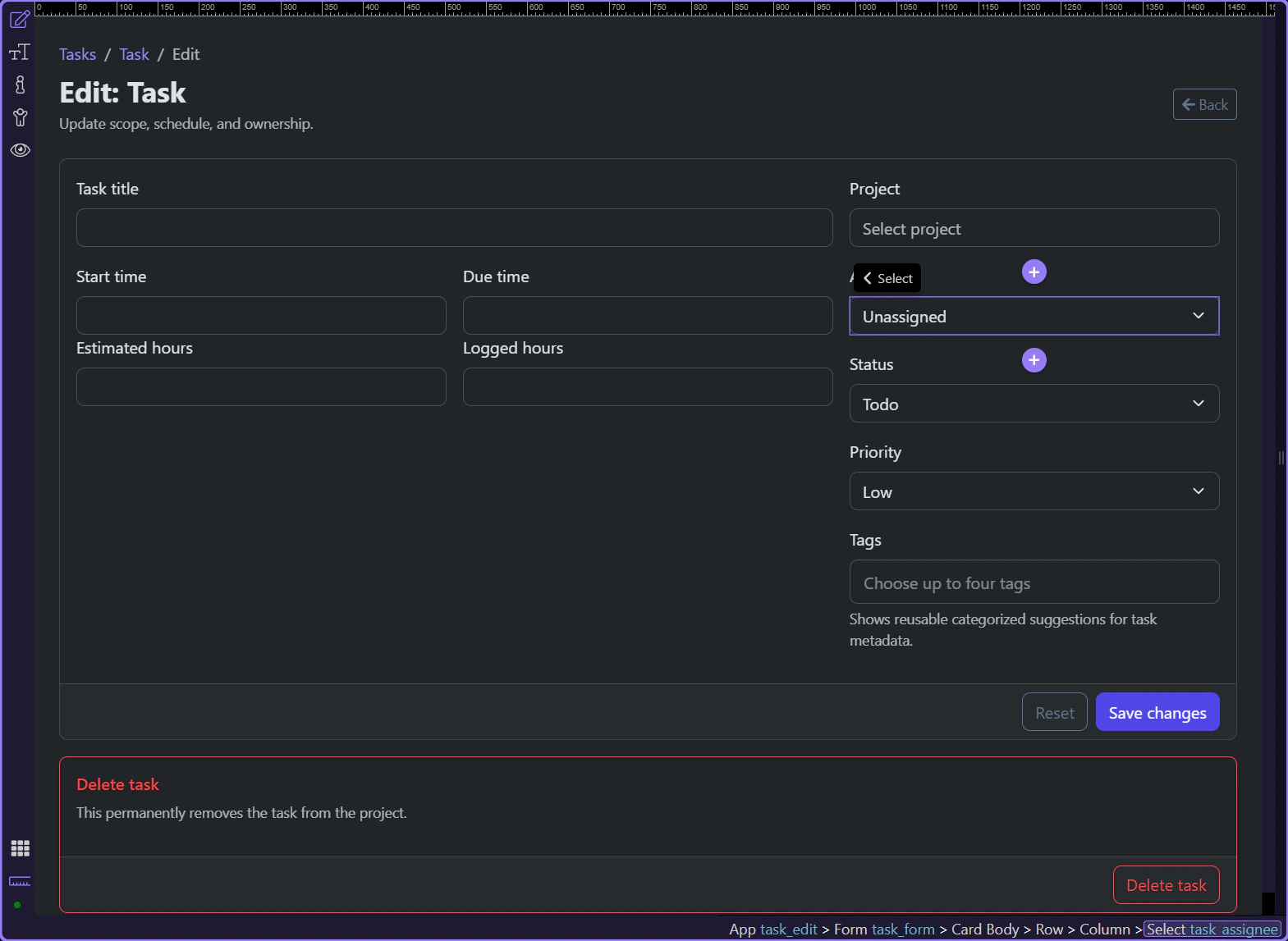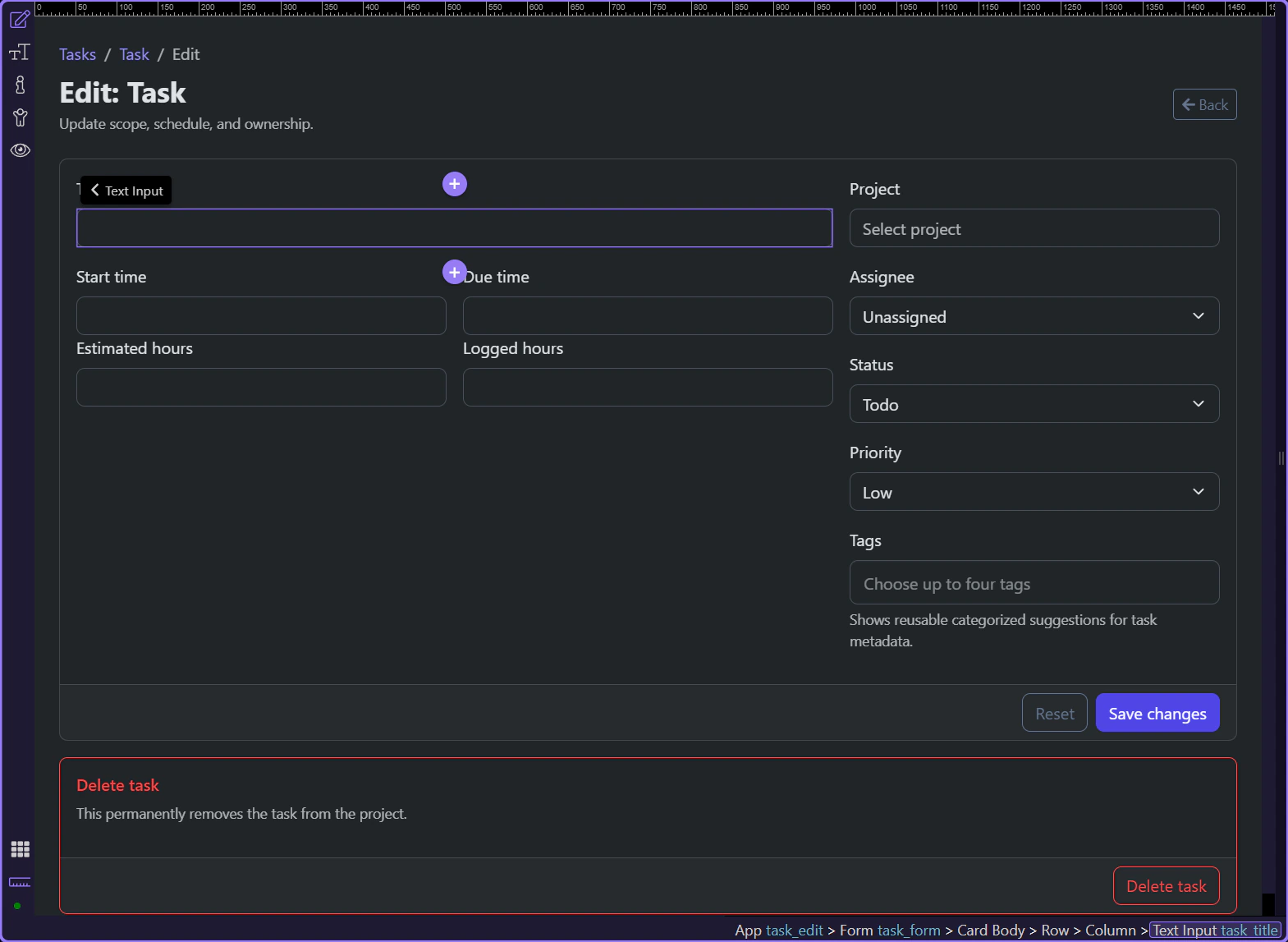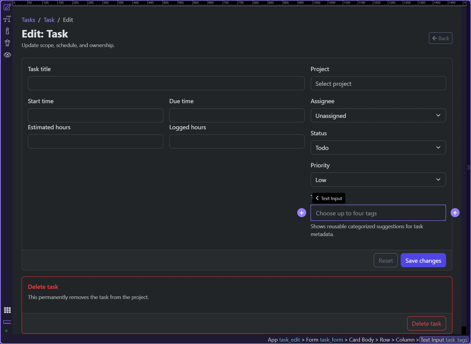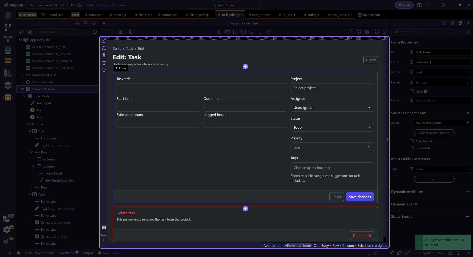 Section titled “Edit forms must restore state before the user edits”The task edit page shows the real difference between create and edit forms. On an edit page, controls should already reflect the stored record so the user is correcting or extending data, not rebuilding it from memory. App Connect bindings make that restoration explicit.