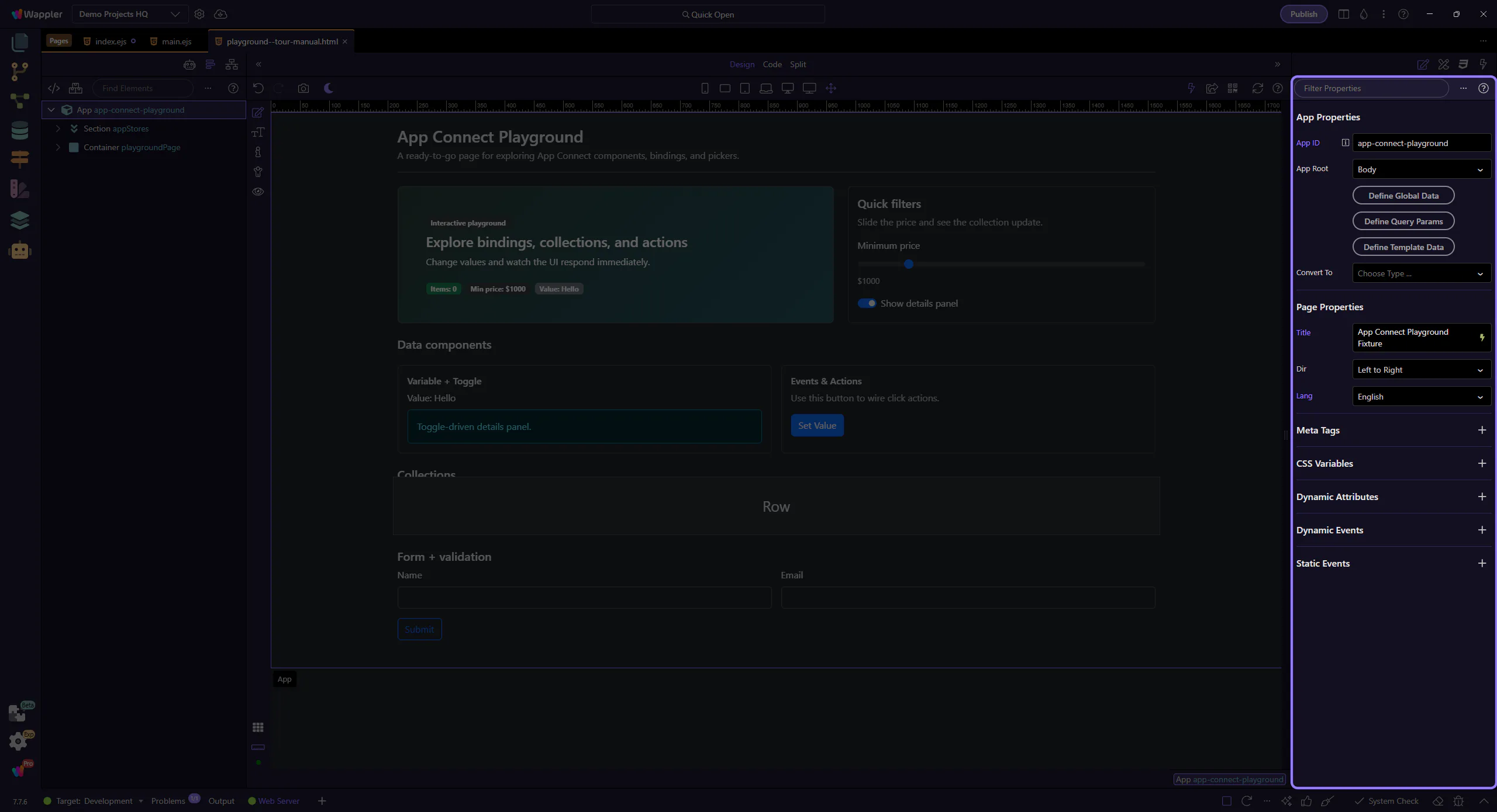 Section titled “Events & actions”This tour builds the event-to-action mental model that underpins most App Connect interactions. You will trace how a user event is configured in Properties, how Wappler stores the action list behind that event, and how the rest of the page reacts when the action runs.