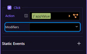 Section titled “Working with the Click event and modifiers”The Click event is the most common event. Modifiers control default behavior and add conditions.