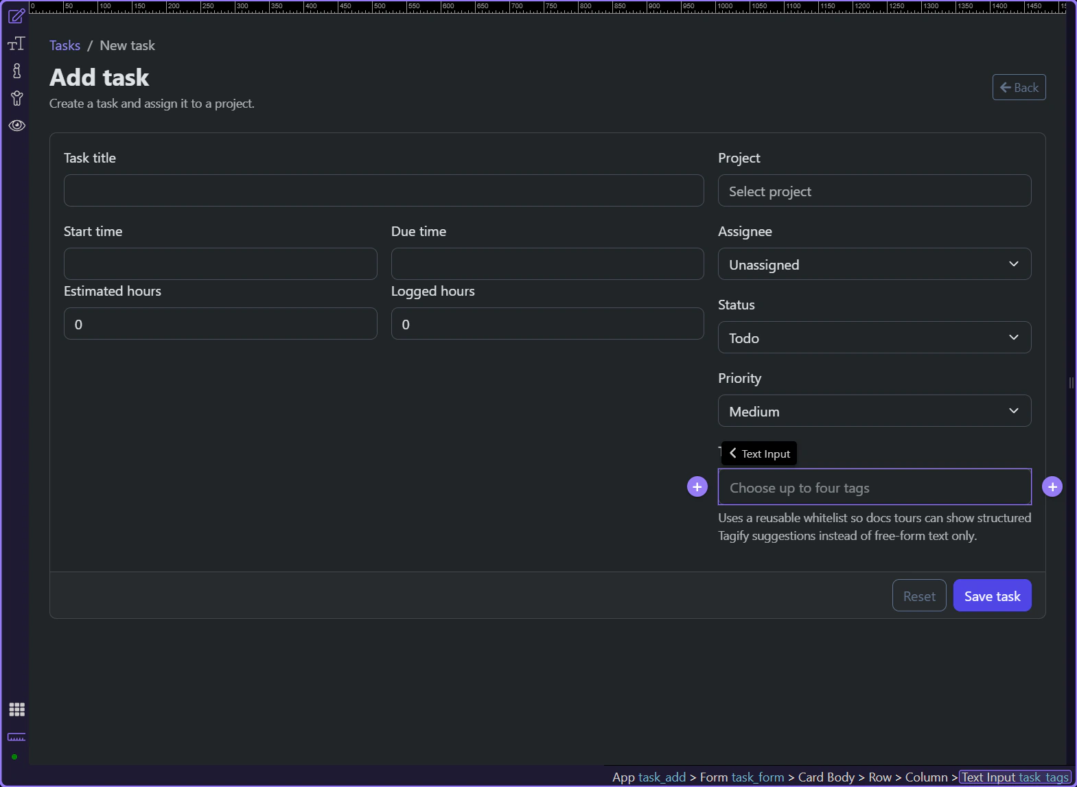 Section titled “Real form controls depend on live data sources”The new-task page is not driven by static markup alone. Projects, contacts, and tag suggestions all arrive through data components first, then feed the controls users actually interact with. This tour stays on that page so the data-to-field relationship stays concrete.