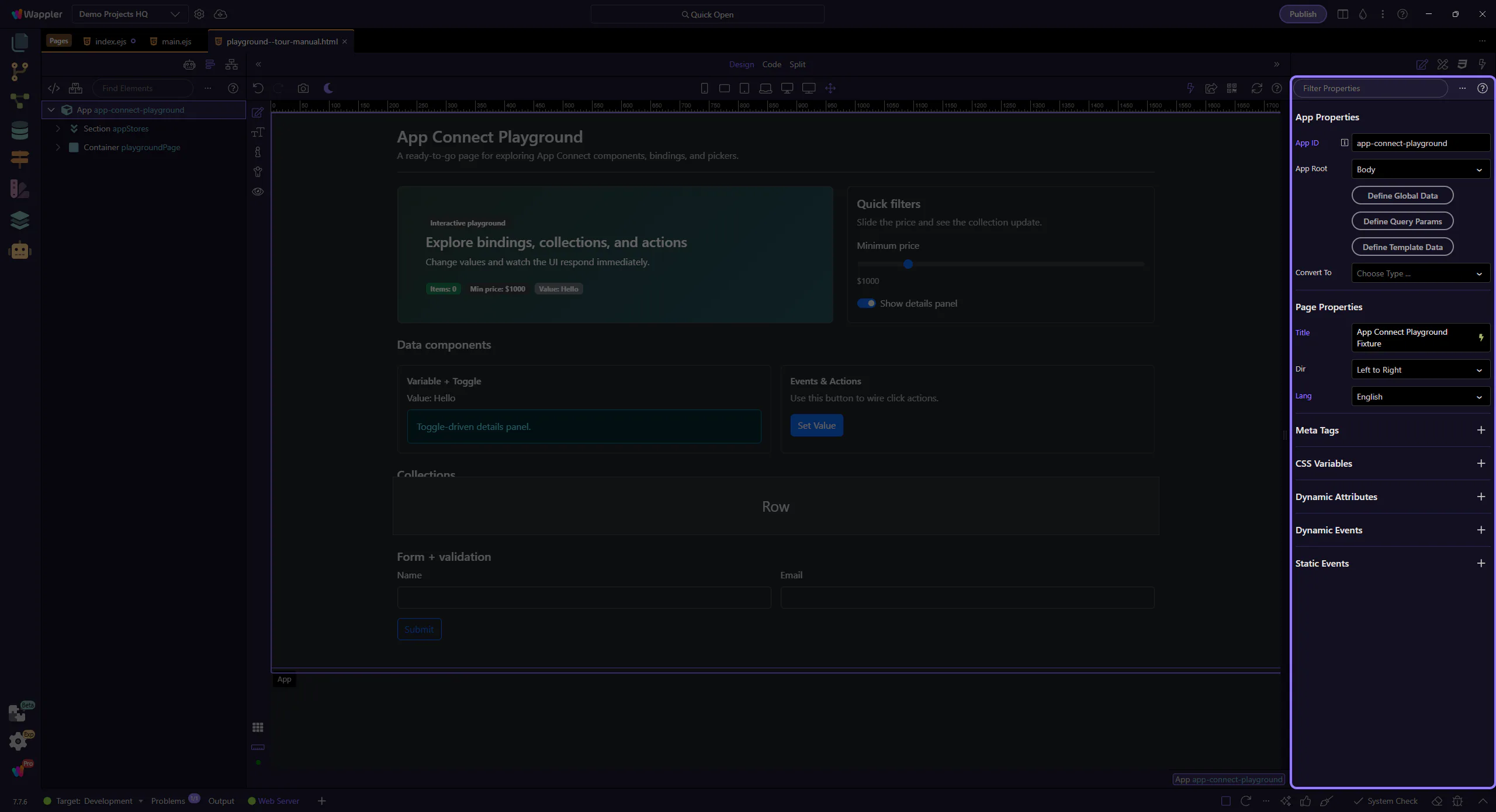 Use App Connect formatters to transform values (date, currency, text, collections) using Wappler’s expression picker.