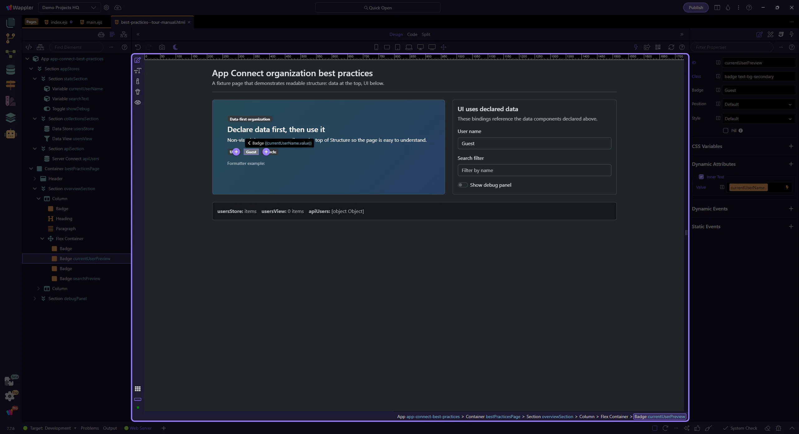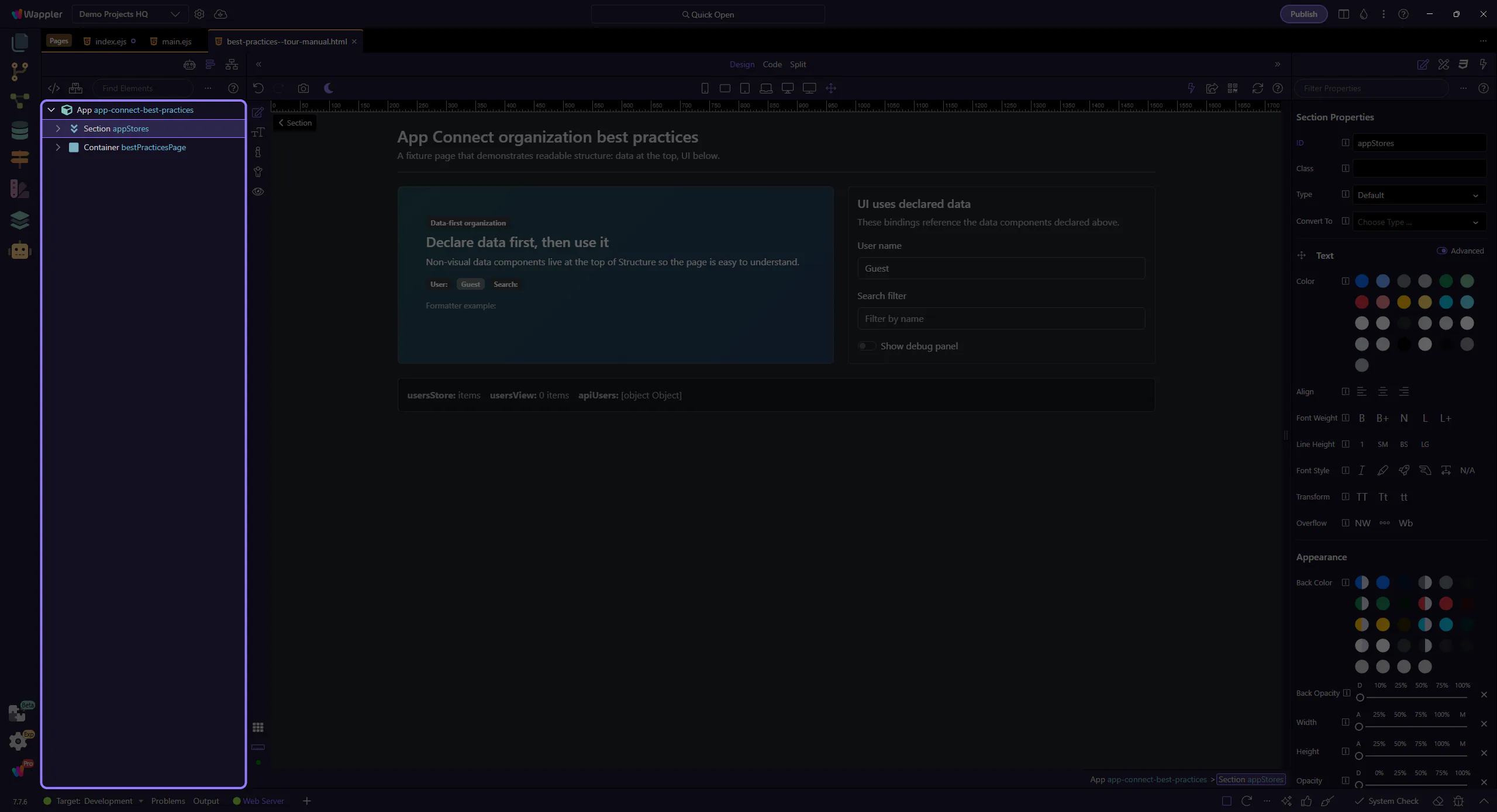 Section titled “Introduction”This tour uses a deliberately structured page to show why App Connect projects stay easier to maintain when data comes first. You will compare the visual layout with the non-visual components that feed it, then use that example to build a stronger mental model for grouping, naming, and placing state and data sources in Structure.