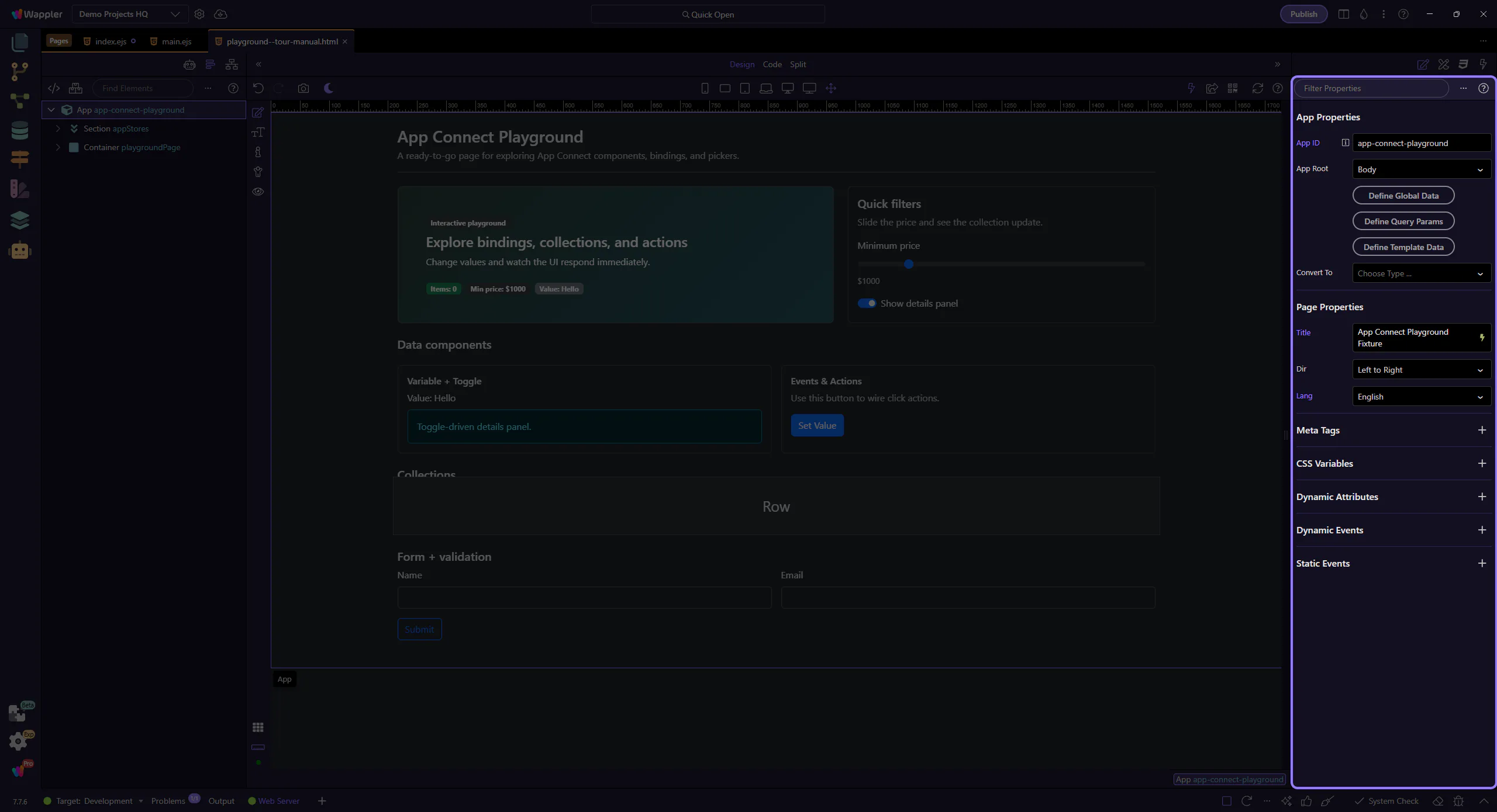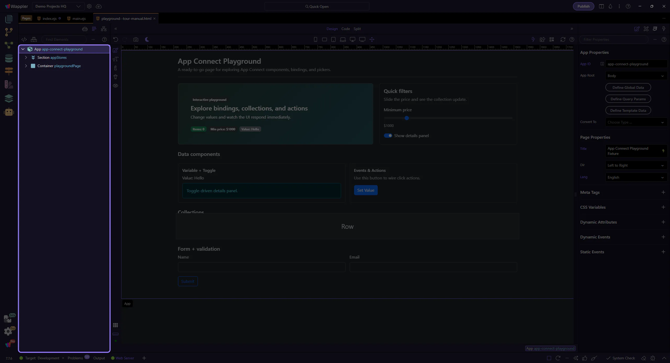 Section titled “Reactive basics”Build an accurate mental model for App Connect: data drives UI, and events run actions that update data. Wappler’s pickers help you wire this visually.