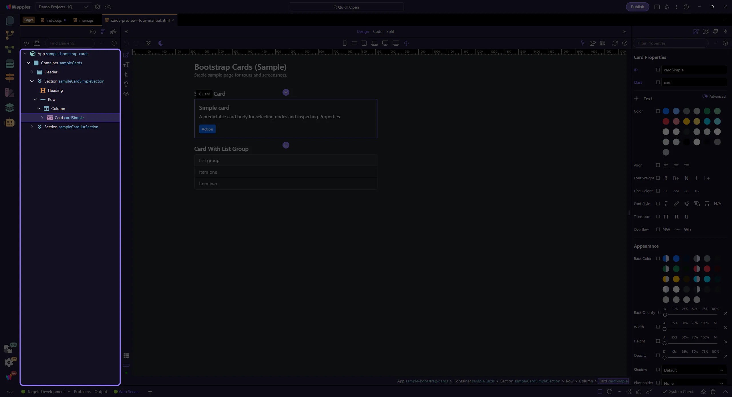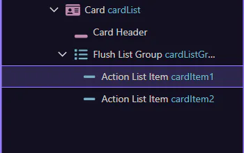 Section titled “Card: Nested structure”In App Structure, note the typical layout: card → header/body/footer. Select the correct node before styling.