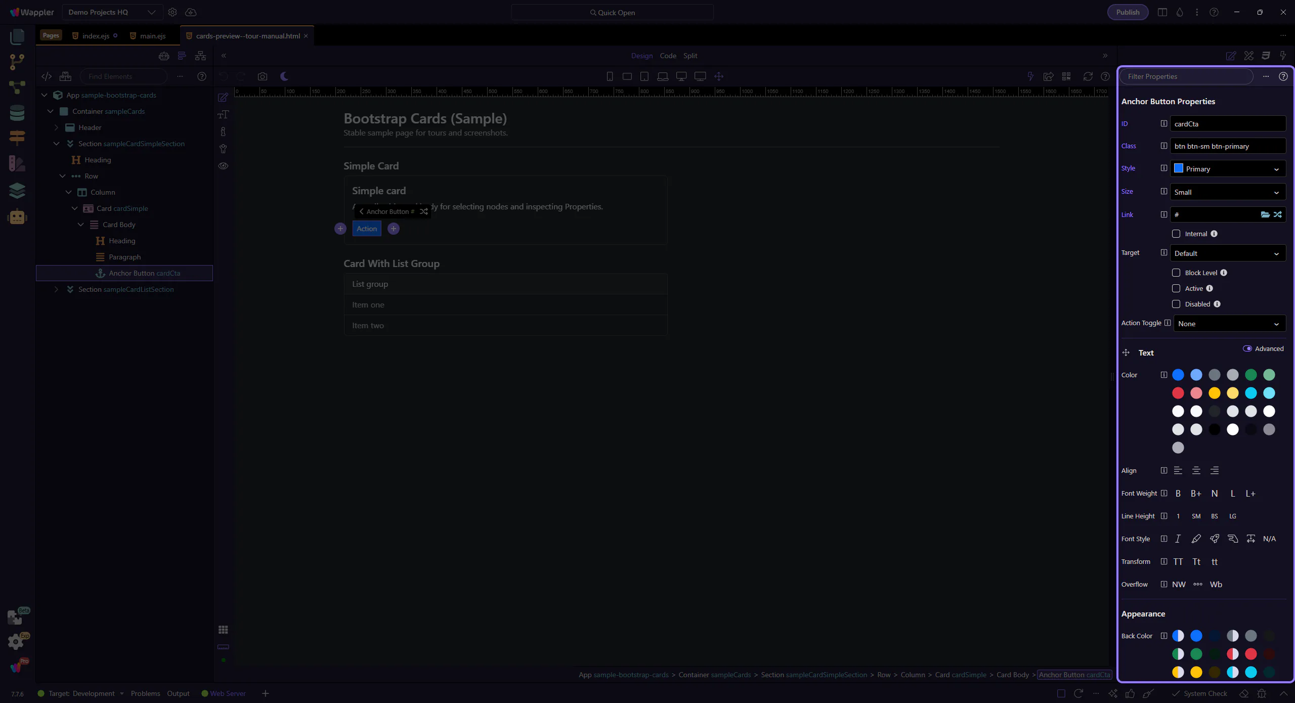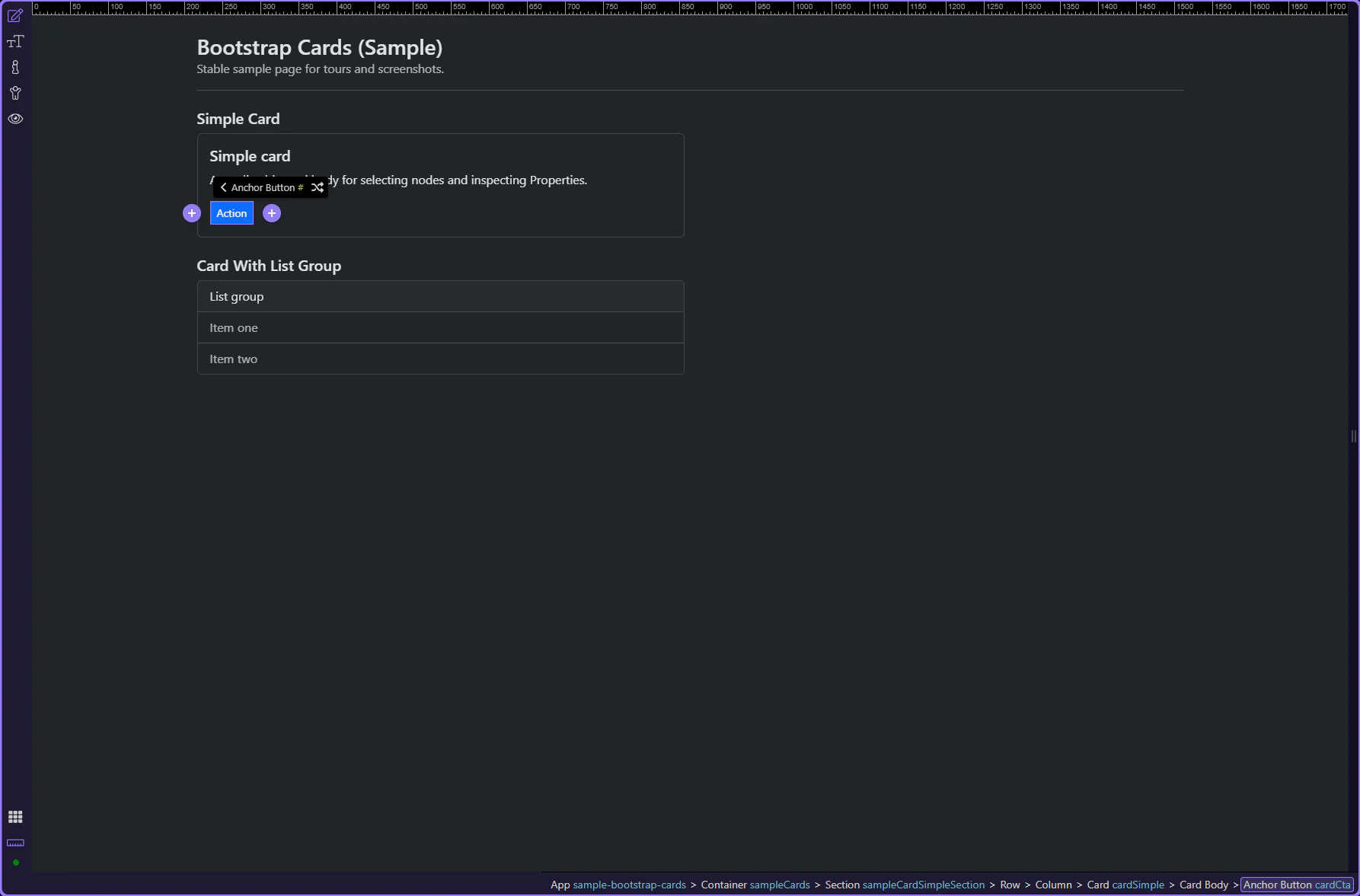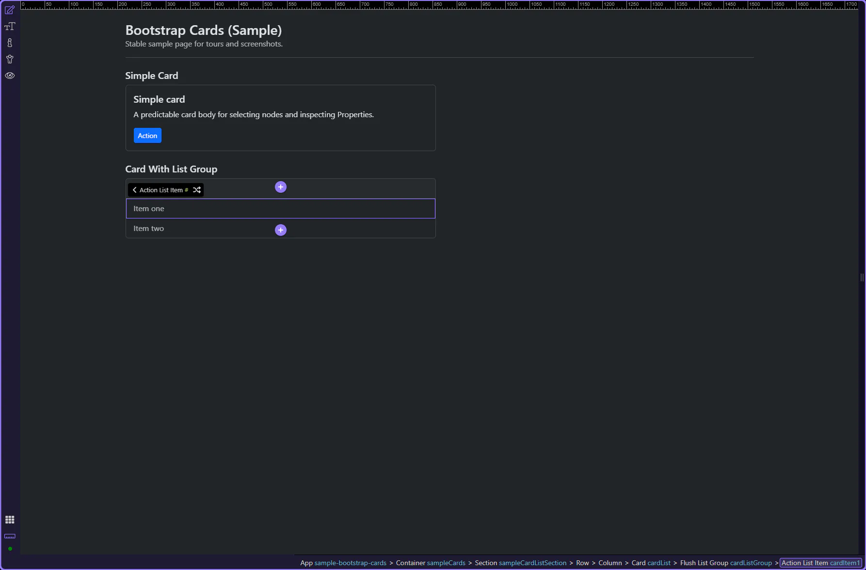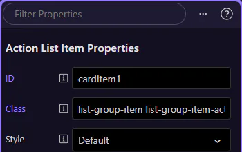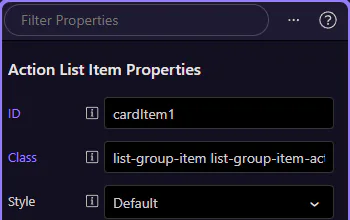 Section titled “Card: Lists and actions”Cards often contain nested components: list-groups and buttons/links inside the body. Always select the nested component to configure its own Properties.