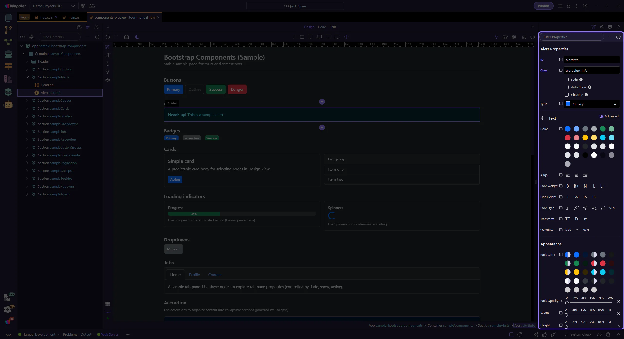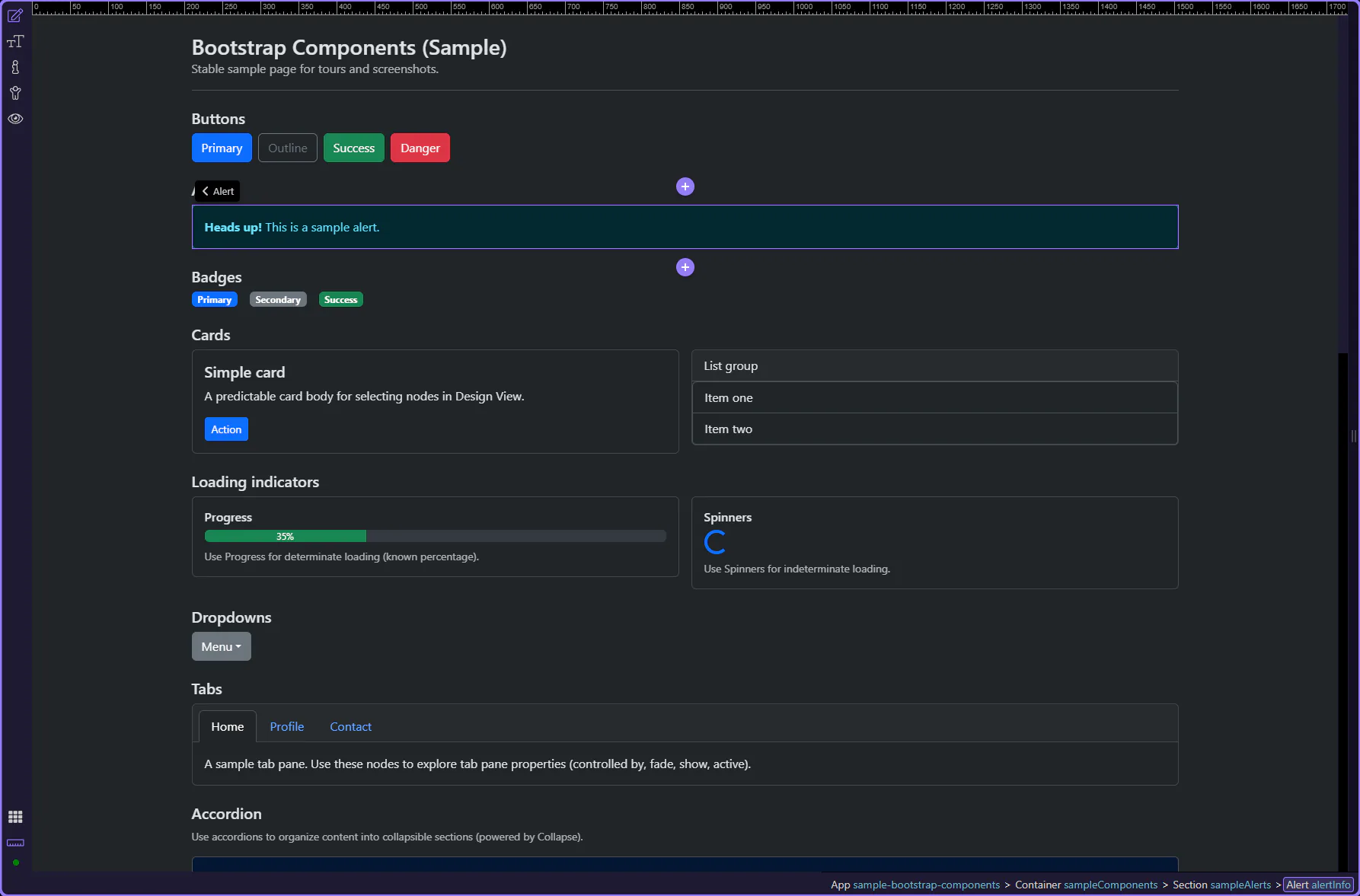 Section titled “Alert example”Alerts communicate status messages—success, warnings, errors, or neutral information. This step matters because Alert example is part of Design View, and understanding that context makes the next action easier to repeat in your own project.