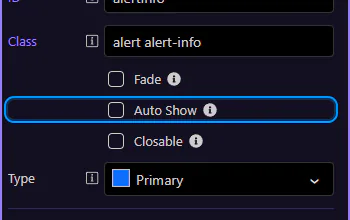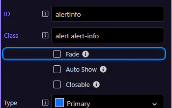 Section titled “Alert: Type”Use Type to change the alert variant (info, warning, danger, success, etc.). This step matters because Alert: Type is part of Selection Panels Properties Alerttype, and understanding that context makes the next action easier to repeat in your own project.