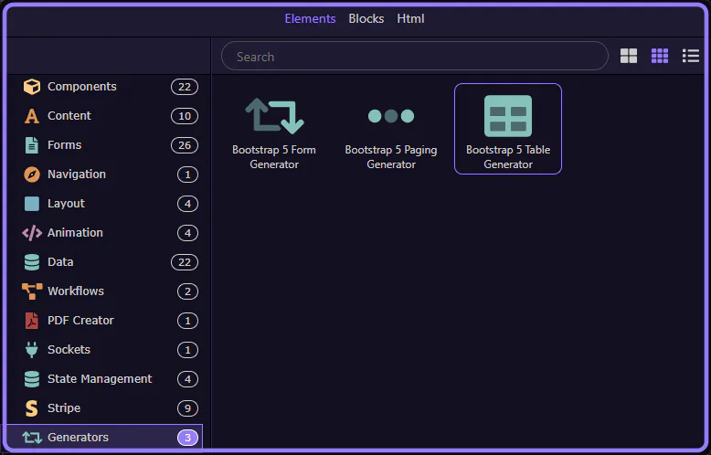 Section titled “Open the generator”Open the Components picker, select the Generators category, then choose Bootstrap 5 Table Generator.