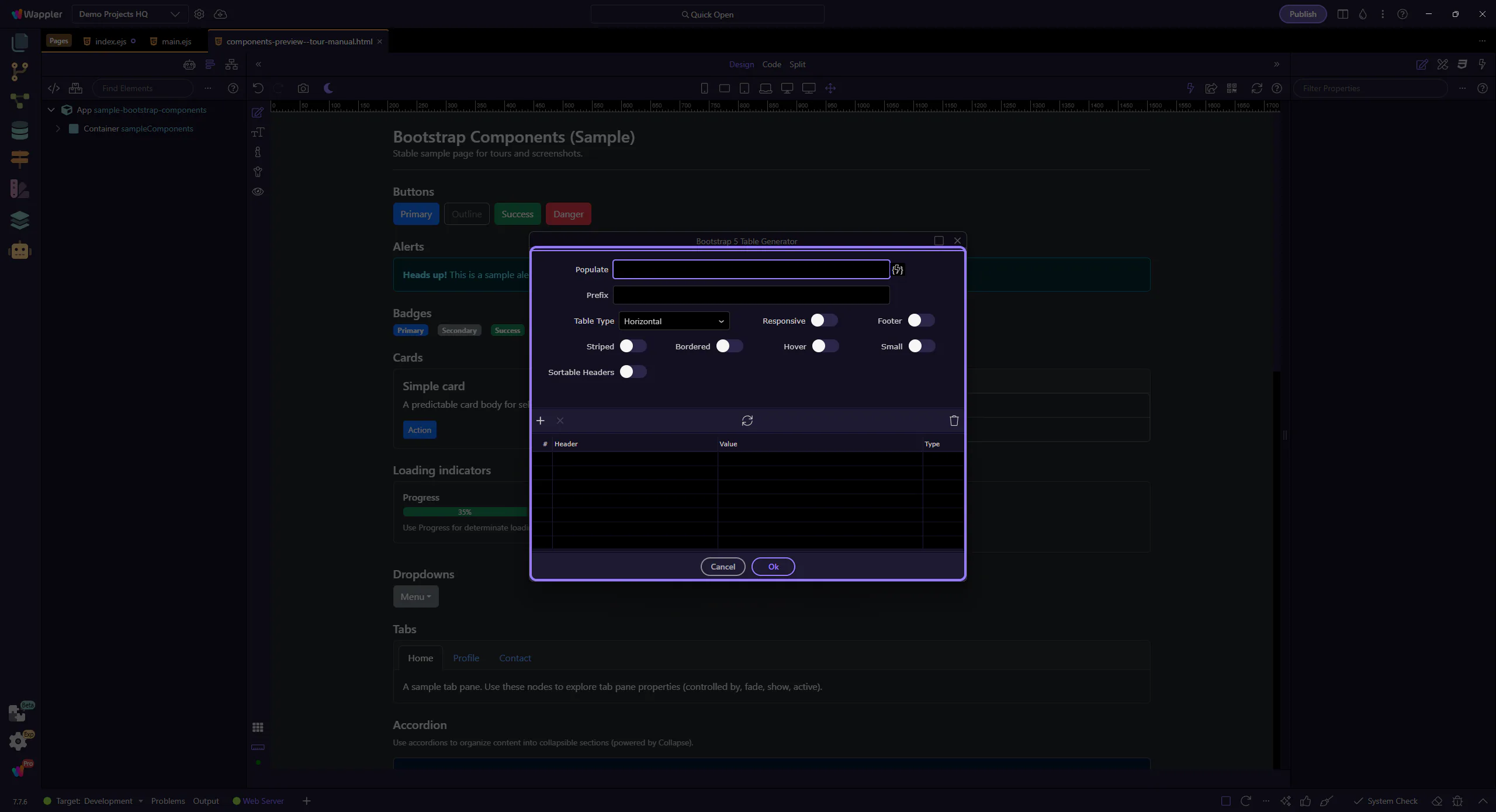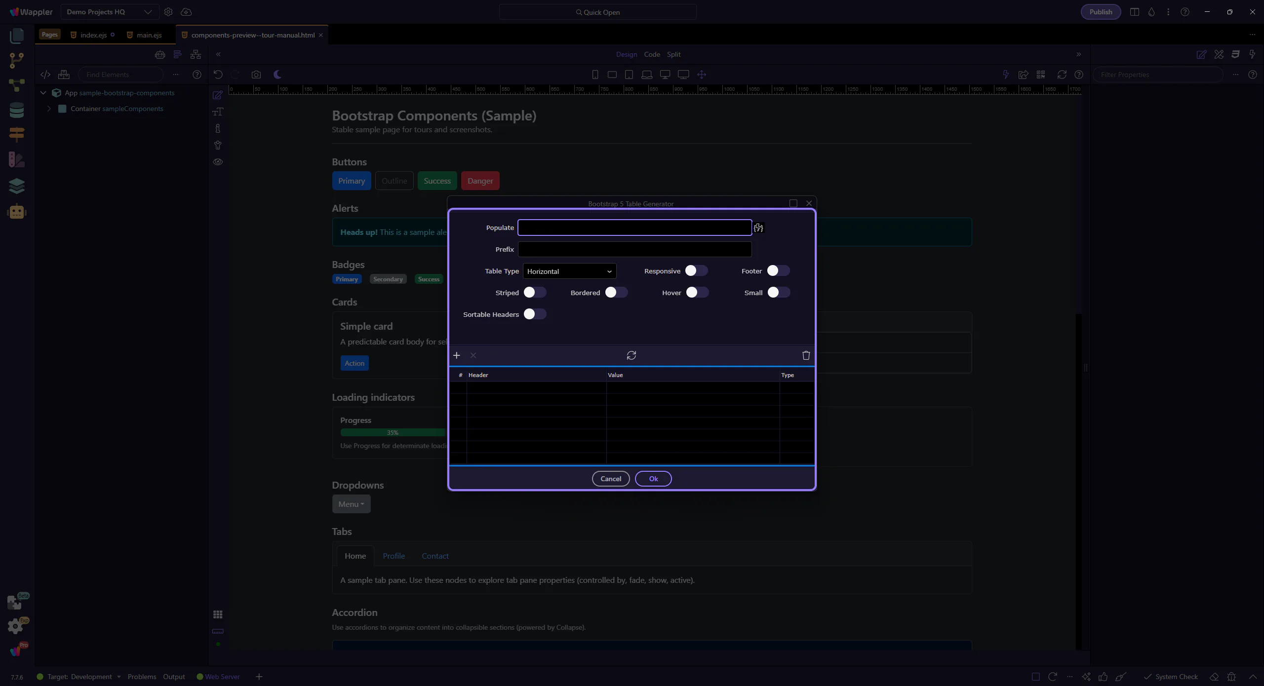 Generate a Bootstrap table quickly with Wappler, then customize columns, styling, and responsive behavior.