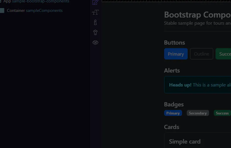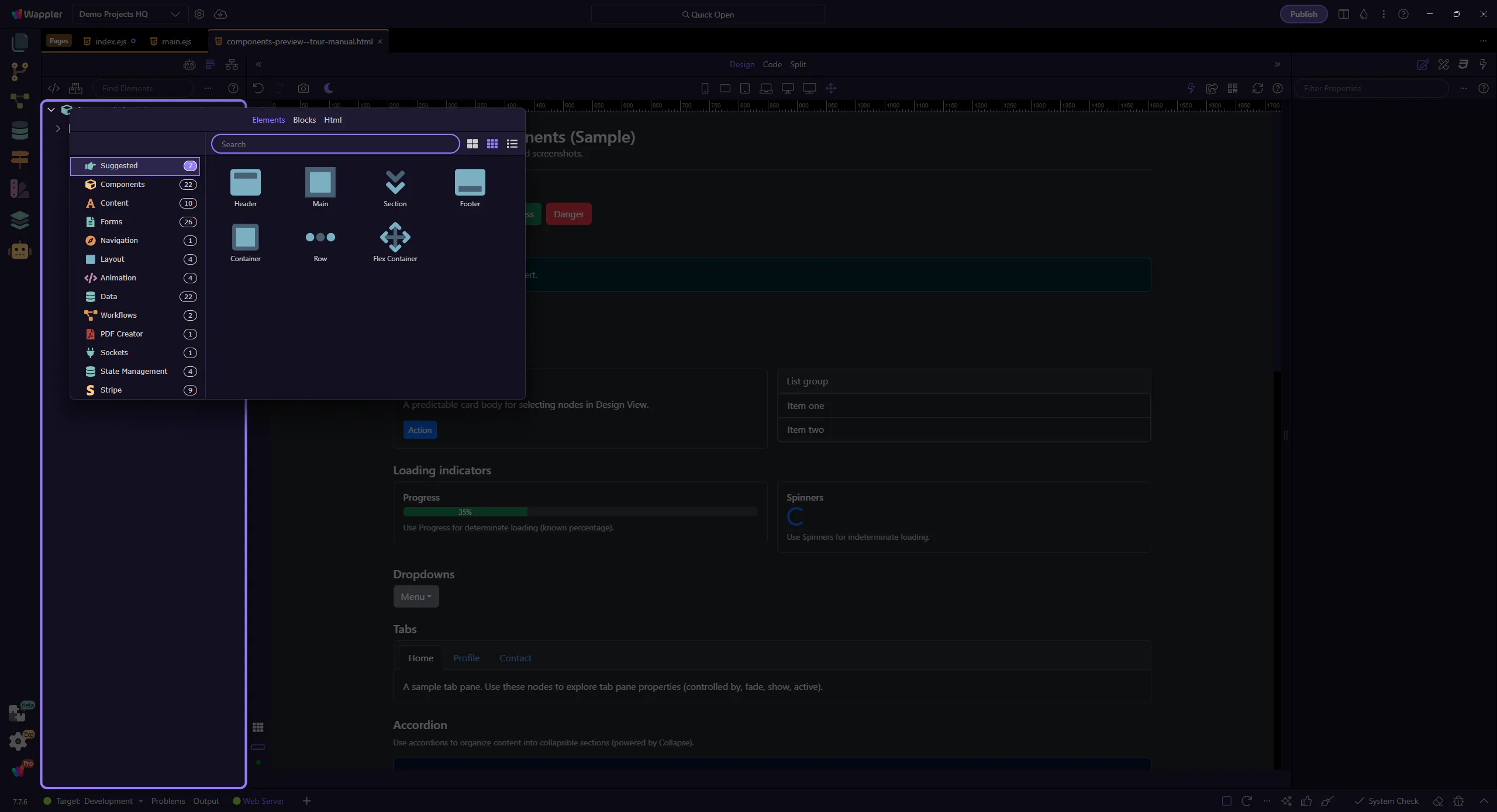 Section titled “Components picker opened”The Components picker is the right place to start when you want Wappler to scaffold a more complex Bootstrap pattern for you. This step explains how generator-driven components differ from simple inserts and why choosing the correct starting tool saves time when the final component needs structure as well as styling.