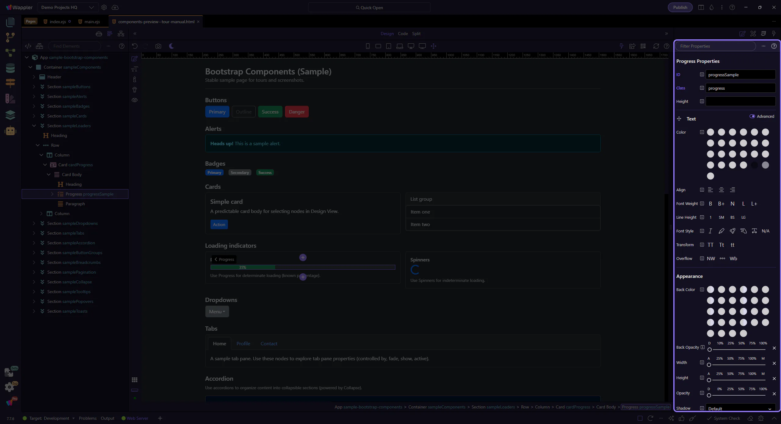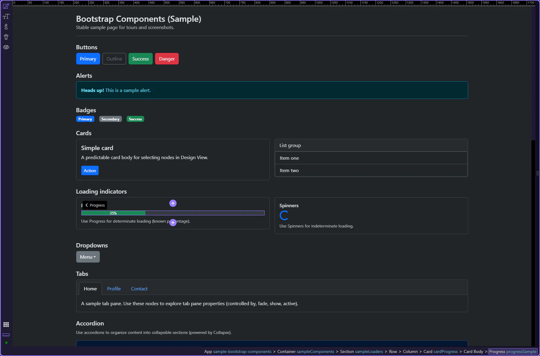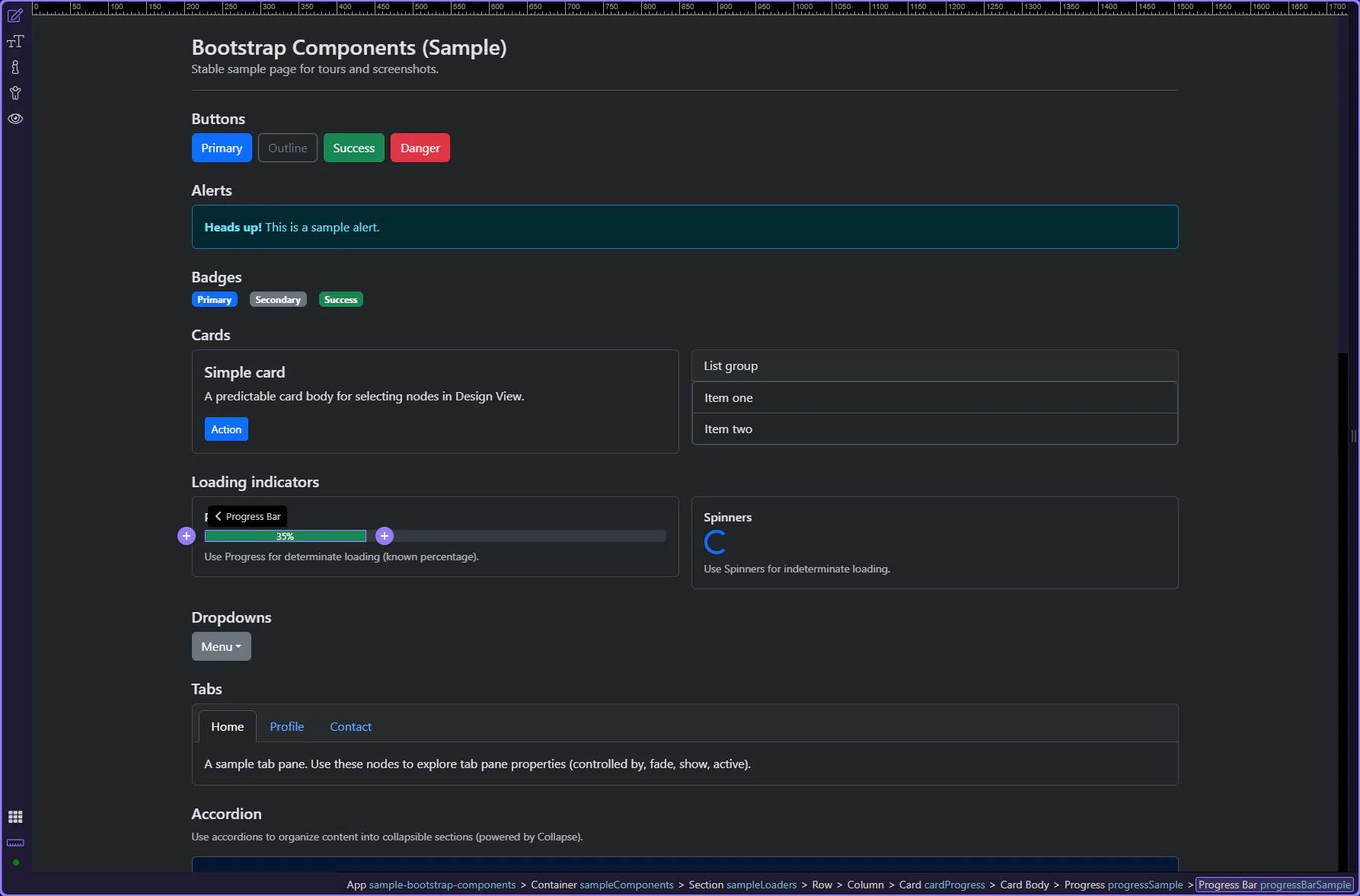 Section titled “Progress bar element”The inner .progress-bar element controls the fill amount and variant styling. This step matters because Progress bar element is part of Design View, and understanding that context makes the next action easier to repeat in your own project.