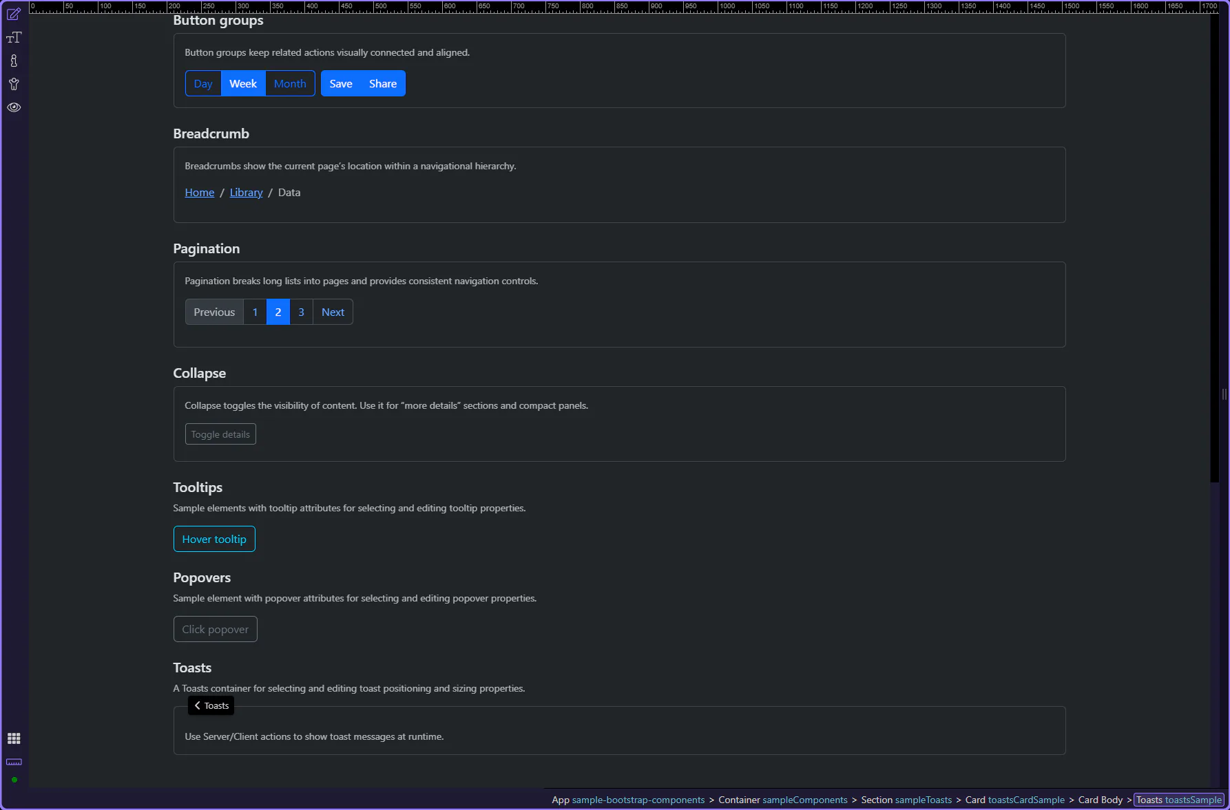 Section titled “Toasts container”This Toasts container controls where toast messages appear. It is selected so you can review its key properties.