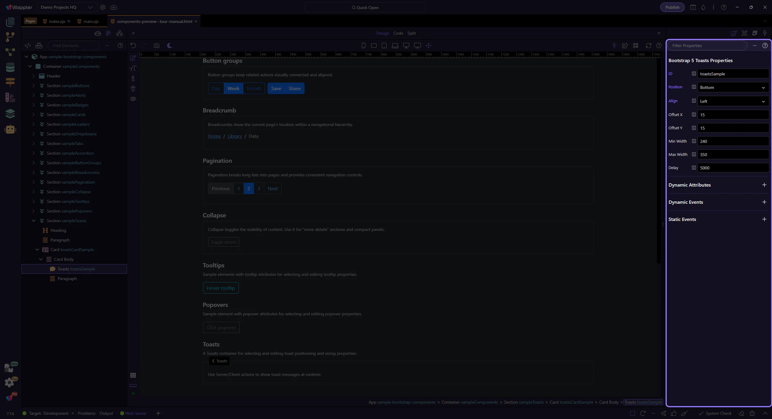 Section titled “Toasts container”Toasts are lightweight notifications that appear over the page. In Wappler you usually add a Toasts container once, then trigger toast messages from actions.