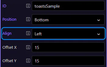 Section titled “Toasts: Align”Use Align to anchor toasts left or right. This step matters because Toasts: Align is part of Selection Panels Properties Toastsalign, and understanding that context makes the next action easier to repeat in your own project.
