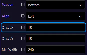 Section titled “Toasts: Offset Y”Offset Y controls the vertical spacing from the chosen edge. This step matters because Toasts: Offset Y is part of Selection Panels Properties Toastsoffsety, and understanding that context makes the next action easier to repeat in your own project.