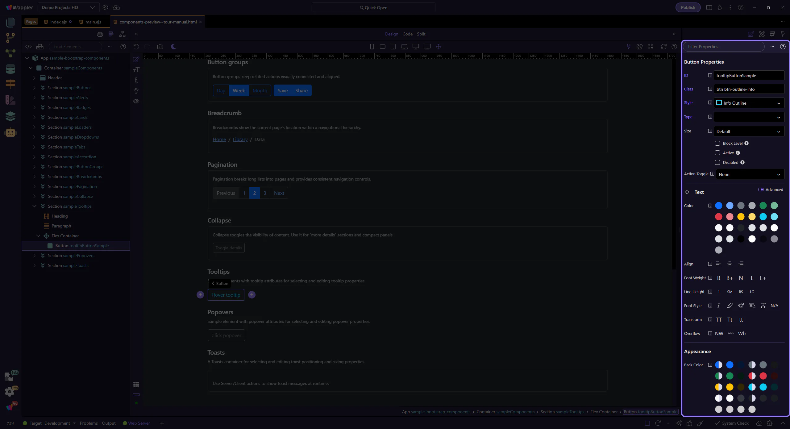 Section titled “Tooltips”Tooltips add short contextual hints. In Wappler you enable a tooltip on an element, then configure its content and behavior from the Properties panel.