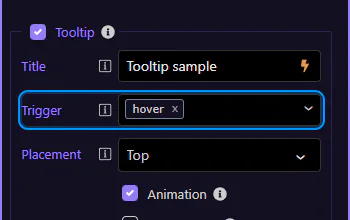 Section titled “Tooltip: Trigger”Use Trigger to control when the tooltip appears: hover, click, or focus. This step matters because Tooltip: Trigger is part of Selection Panels Properties Tooltiptrigger, and understanding that context makes the next action easier to repeat in your own project.