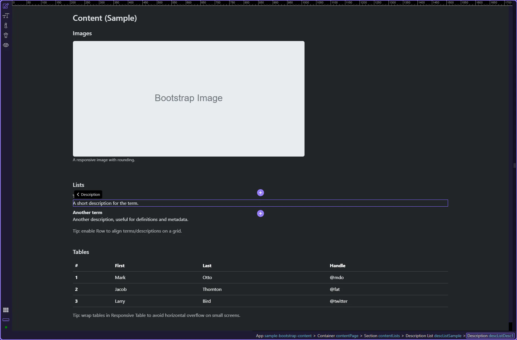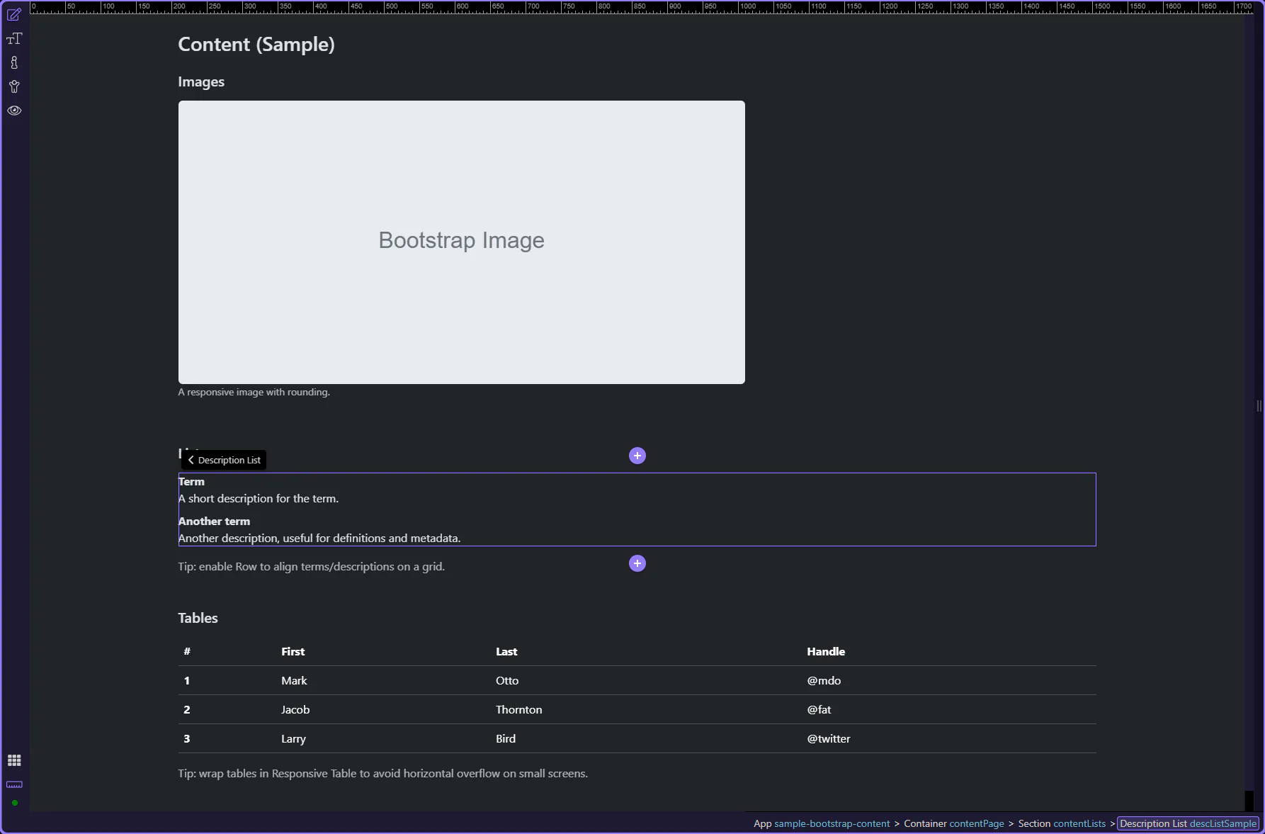 Section titled “Description list example”This description list example shows how Bootstrap can present paired labels and values in a way that is easier to scan than a plain paragraph. It is useful for metadata, profile details, and admin summaries where the relationship between each term and its value should stay visually obvious.