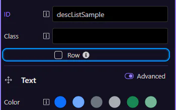 Section titled “Row layout”Enable Row to align terms and descriptions using Bootstrap’s grid. This step matters because Row layout is part of Selection Panels Properties Desclistrow, and understanding that context makes the next action easier to repeat in your own project.