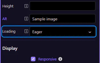 Section titled “Image: Loading”Use Loading to enable lazy loading for below-the-fold images. This step matters because Image: Loading is part of Selection Panels Properties Imgloading, and understanding that context makes the next action easier to repeat in your own project.