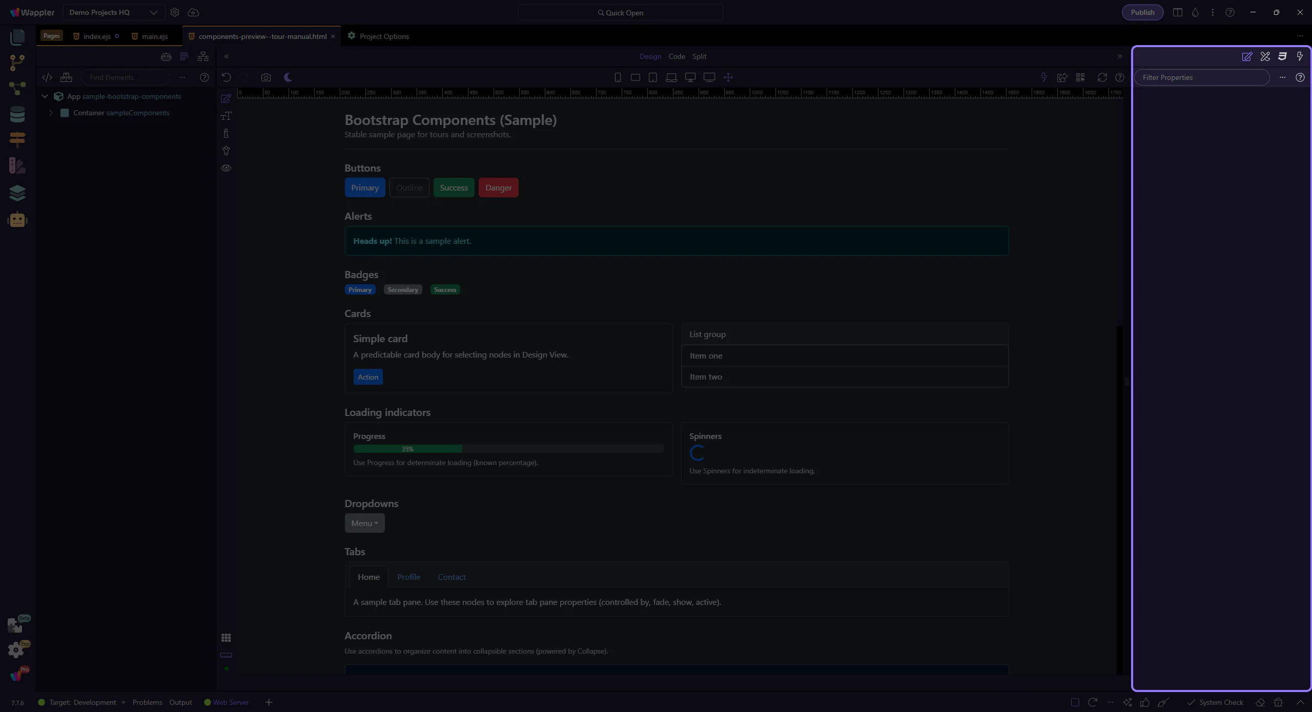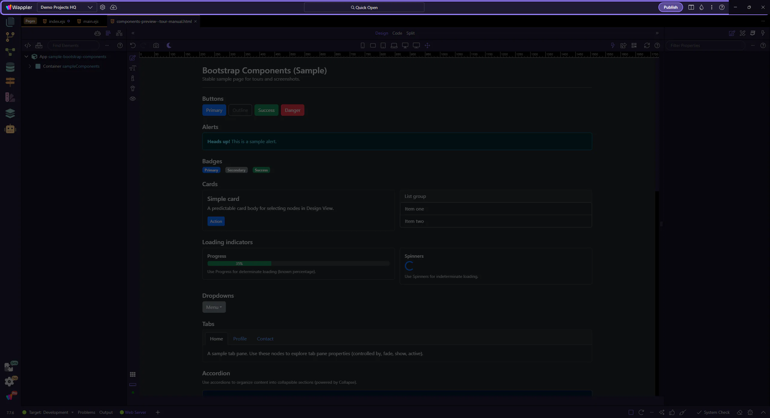 Section titled “Conclusion”With Bootstrap integrated you can start building responsive layouts and adding components visually in Wappler.