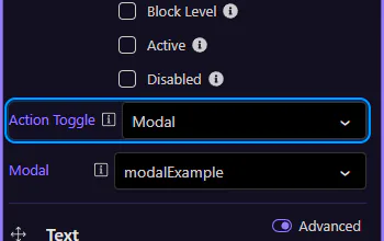 Section titled “Trigger: Toggle type”In Properties, set the trigger Toggle type to Modal. This step matters because Trigger: Toggle type is part of Selection Panels Properties Btndatatooggle, and understanding that context makes the next action easier to repeat in your own project.