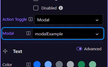 Section titled “Trigger: Target”In Properties, set the trigger Target to the modal element id. This step matters because Trigger: Target is part of Selection Panels Properties Btntoggletargetmodal, and understanding that context makes the next action easier to repeat in your own project.