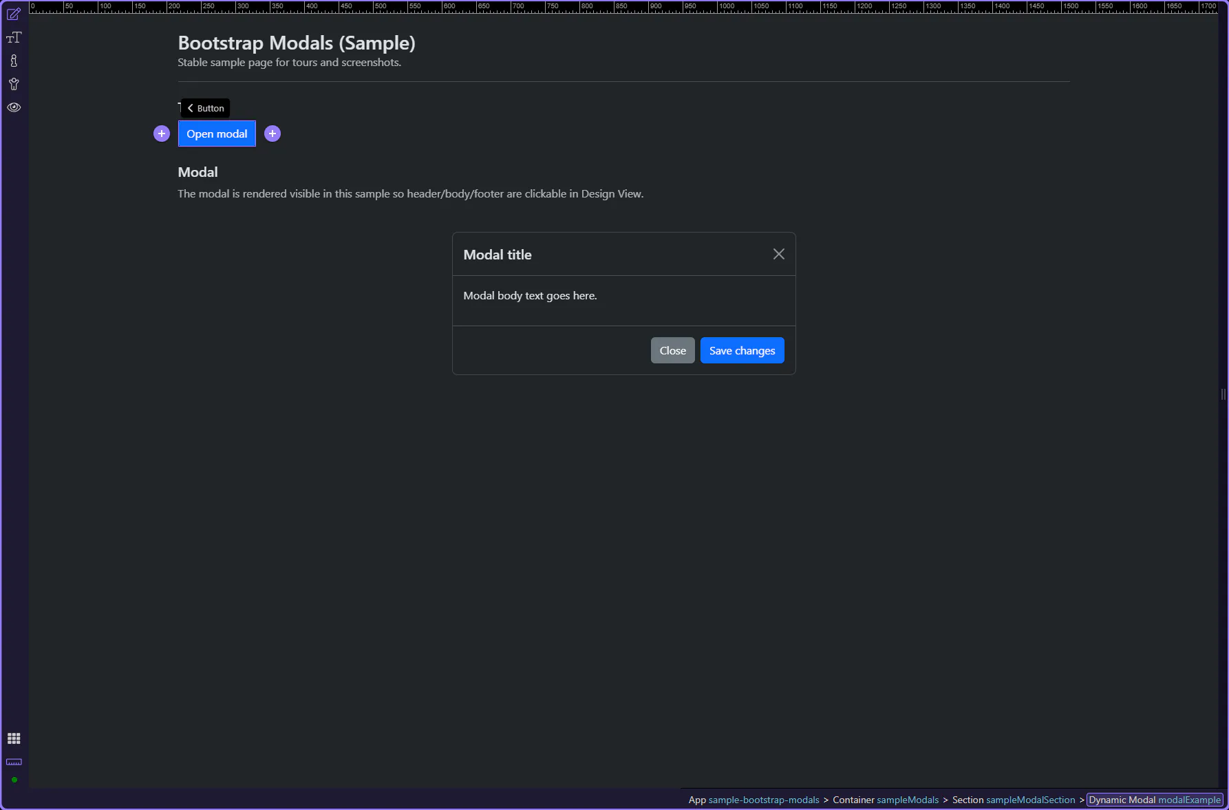 Section titled “Modal body”The modal body holds the main content: text, forms, or other components. This step matters because Modal body is part of Design View, and understanding that context makes the next action easier to repeat in your own project.