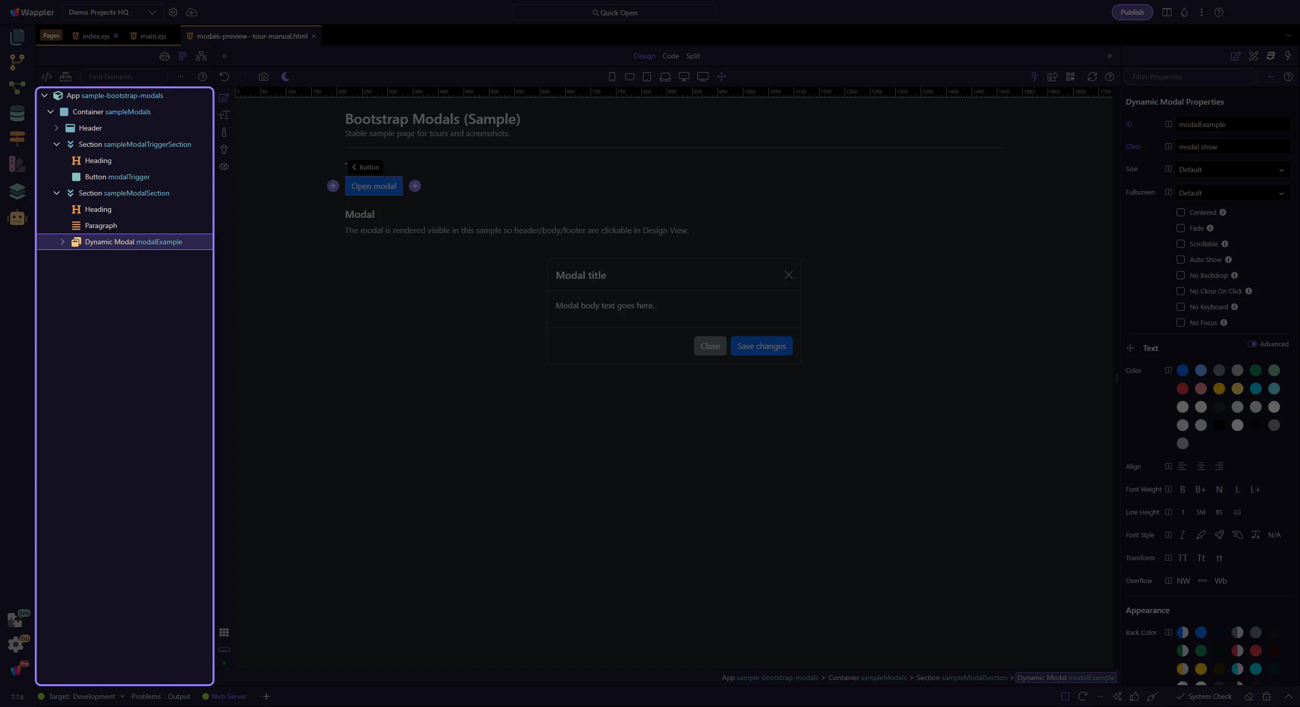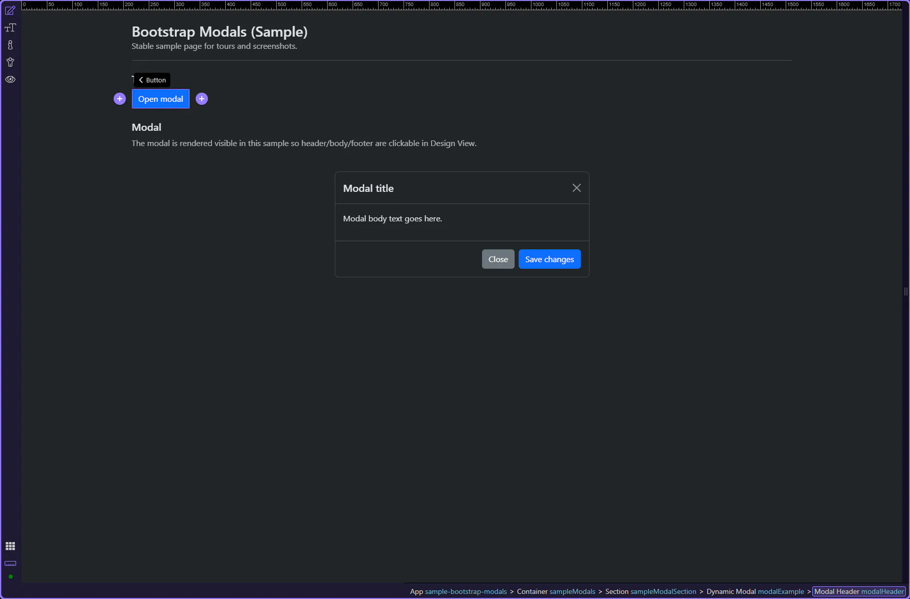 Section titled “Modal header”The modal header usually contains the title and the close control. This step matters because Modal header is part of Design View, and understanding that context makes the next action easier to repeat in your own project.