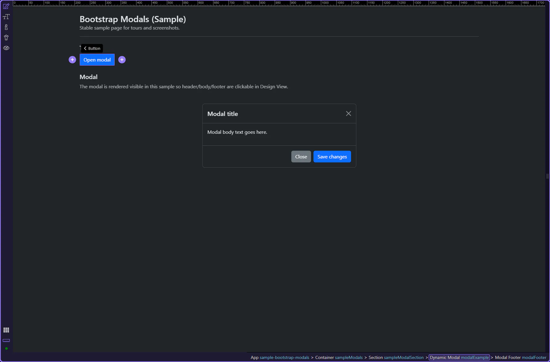 Section titled “Modal footer”The modal footer is optional, and it’s a good place for action buttons. This step matters because Modal footer is part of Design View, and understanding that context makes the next action easier to repeat in your own project.