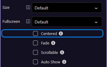 Section titled “Modal: Centered”In Properties, use Centered to vertically center the dialog. This step matters because Modal: Centered is part of Selection Panels Properties Modalcentered, and understanding that context makes the next action easier to repeat in your own project.