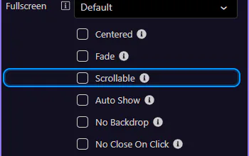 Section titled “Modal: Scrollable”Use Scrollable when your content can exceed the viewport height. This step matters because Modal: Scrollable is part of Selection Panels Properties Modalscrollable, and understanding that context makes the next action easier to repeat in your own project.