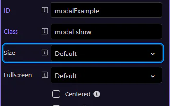 Section titled “Modal: Size”Use Size to change the dialog width (e.g. sm/lg/xl depending on the component). This step matters because Modal: Size is part of Selection Panels Properties Modalsize, and understanding that context makes the next action easier to repeat in your own project.