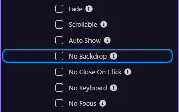 Section titled “Modal: No Backdrop”Disable the backdrop only when you have a clear alternative dismissal flow. This step matters because Modal: No Backdrop is part of Selection Panels Properties Modalnobackdrop, and understanding that context makes the next action easier to repeat in your own project.
