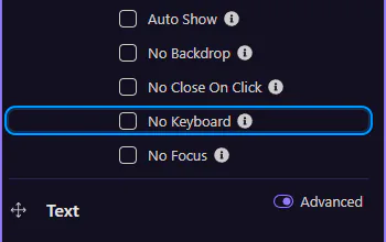 Section titled “Modal Properties to Review”Next, review key behavior properties. These control how users can dismiss the modal and how it behaves for accessibility.