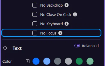 Section titled “Modal: Focus”No Focus prevents focusing the modal when initialized. Combine with accessibility best practices for your UI.